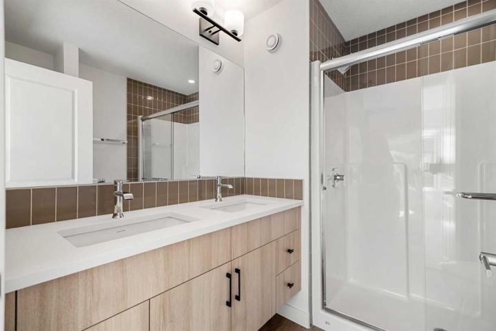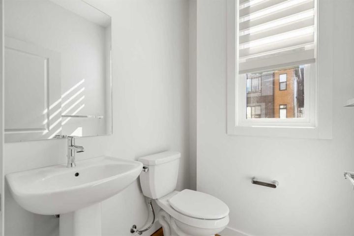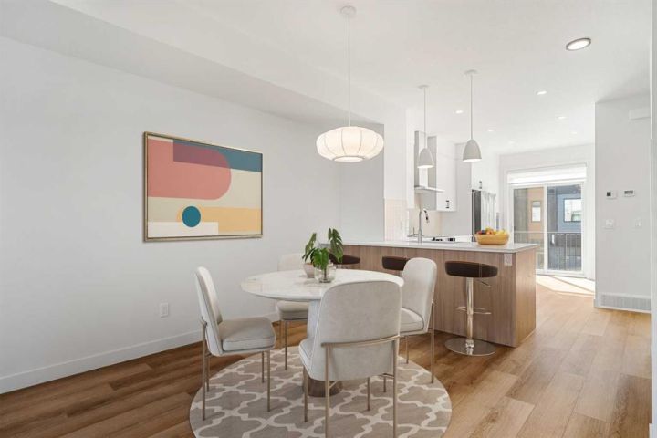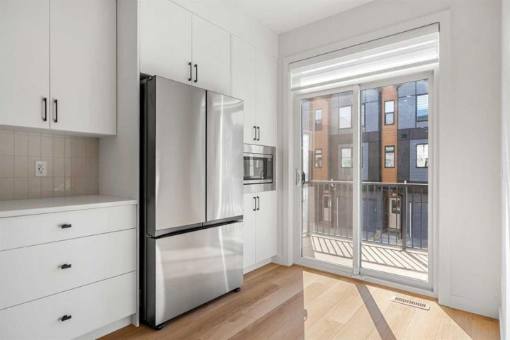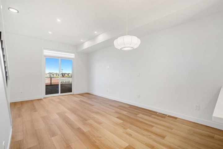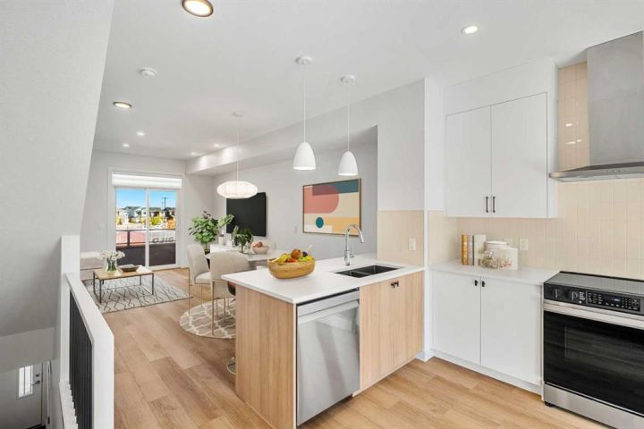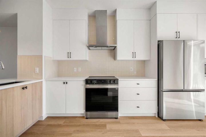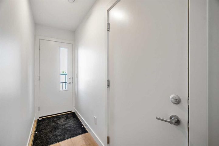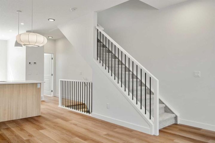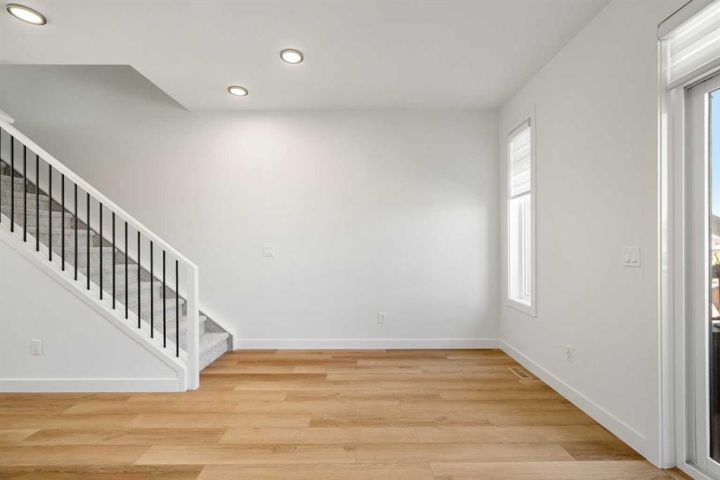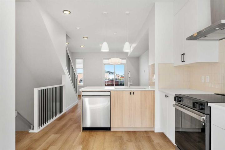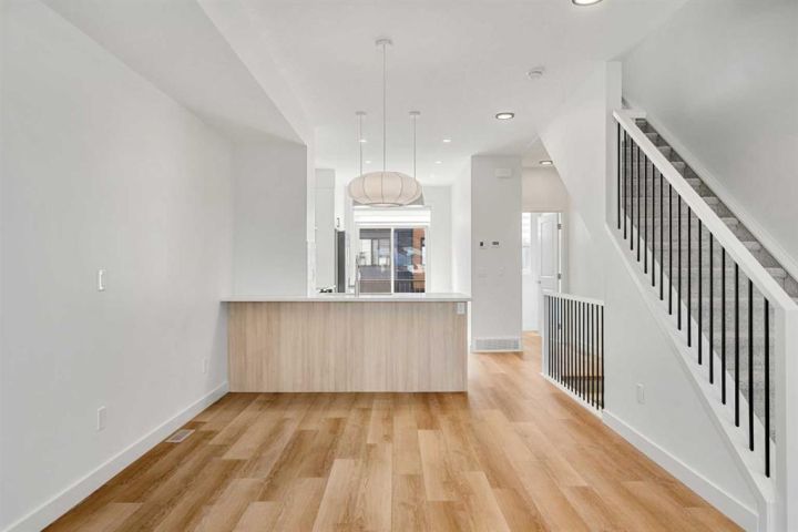The main floor showcases a semi built-in kitchen with sleek quartz countertops, stainless steel appliances, and a gas line hook-up to the BBQ. A unique feature of this unit is the bar-style layout with the built-in dishwasher, adding functionality and style to the heart of the home. The open-concept dining and living area is enhanced with additional lighting, creating a warm and inviting space. From here, step out onto one of your two balconies—perfect for enjoying morning sun from the east or evening light from the west. A gas line to the deck makes outdoor cooking simple and convenient.