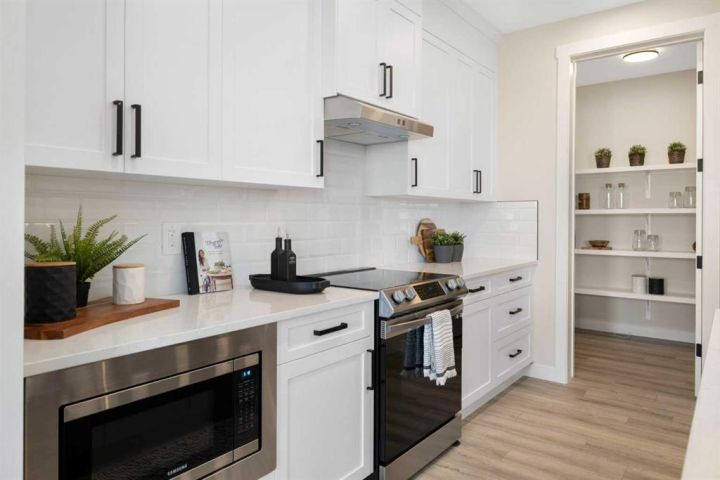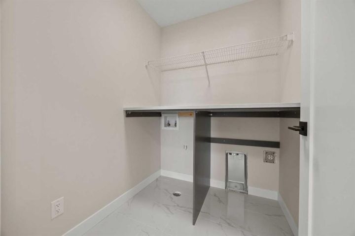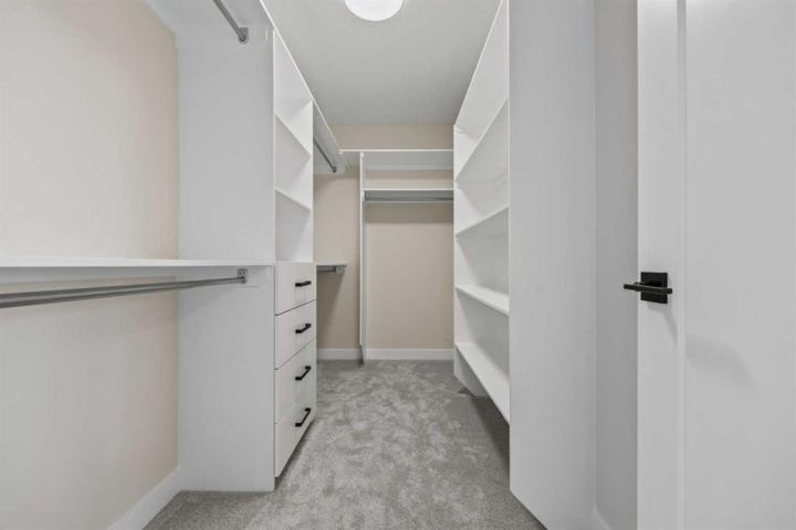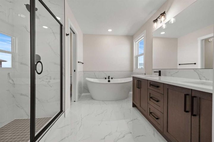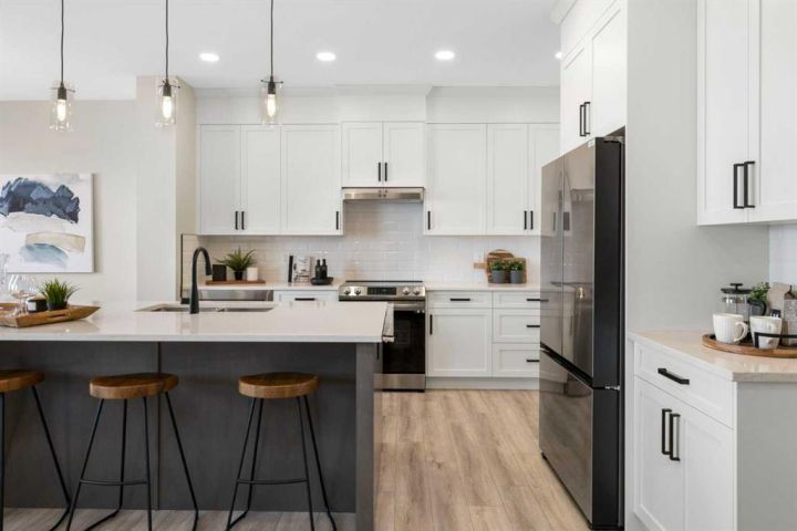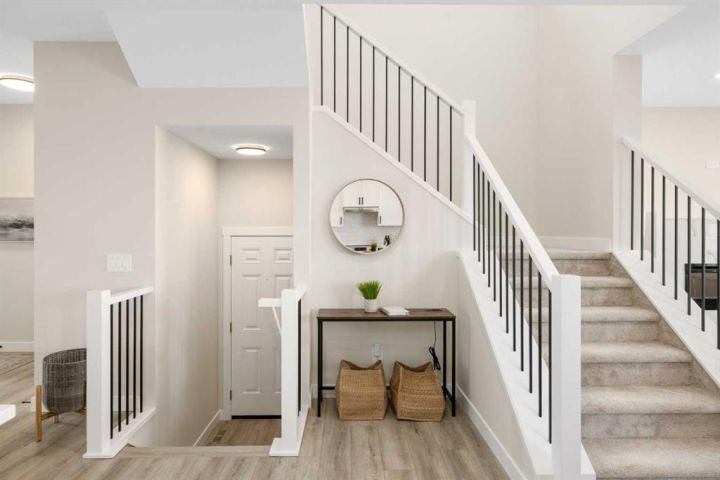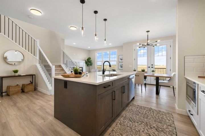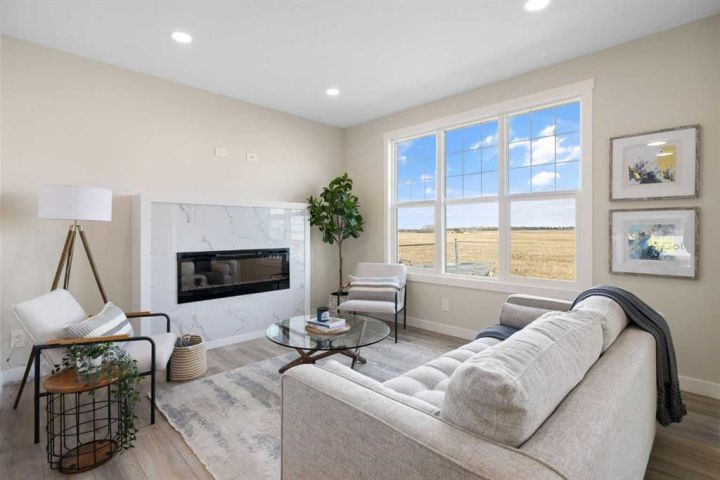 Welcome to 482 Kinniburgh Loop—an elegantly designed 1,840 sq. ft. duplex in the highly sought-after community of Kinniburgh South, Chestermere. Built by award-winning luxury builder Golden Homes, this residence blends modern living, functionality, and timeless design—all just minutes from schools, everyday amenities, and Lake Chestermere. The main floor features an inviting open-concept layout with soaring 9’ ceilings and 8’ doors, creating a spacious and grand feel. As you enter, you’re welcomed by a large 8’ front door with a built-in glass window, setting the tone for the luxury inside. The front of the home includes a convenient half bath, access to your basement, and beautifully finished stairs leading down to the undeveloped basement. This home also includes a side entrance for added flexibility. At the heart of the home is a chef-inspired kitchen boasting a striking two-tone cabinet design, quartz countertops, a large island with breakfast bar seating, ceiling-height painted cabinetry, and sleek stainless-steel appliances. Oversized triple-pane windows flood the living and dining areas with natural light, creating a bright, warm space that’s perfect for entertaining, relaxing, and everyday living. The living room is completed with an electric fireplace featuring multiple color settings and heat modes, adding both style and comfort. Upstairs, the oversized grand staircase with white railings and matte black iron spindles leads you to the luxurious primary bedroom. This bedroom offers a spa-like 5-piece ensuite with a freestanding tub, fully tiled walk-in shower, dual vanities, and an enclosed toilet. The primary bedroom also includes a custom walk-in closet with built-in shelving and organizers, plus stunning sunrise views to start your mornings. Two additional spacious bedrooms and a full bathroom provide plenty of room for family, while the tiled laundry room—complete with a quartz countertop for folding and storage—adds everyday convenience. Premium features throughout include an oversized 20’x22’ garage, upgraded spindle railings, MDF shelving, matte black fixtures and hardware, high-efficiency triple-pane windows for energy savings, and an enhanced party wall for superior soundproofing. Golden Homes’ signature quality and craftsmanship are evident in every detail. The exterior will be fully landscaped, including grading, loam, sod to the side entrance, and a front yard tree—offering instant curb appeal and outdoor enjoyment. With its west-facing orientation, you’ll enjoy beautiful sunrises to begin the day and softer evening light to wind down.