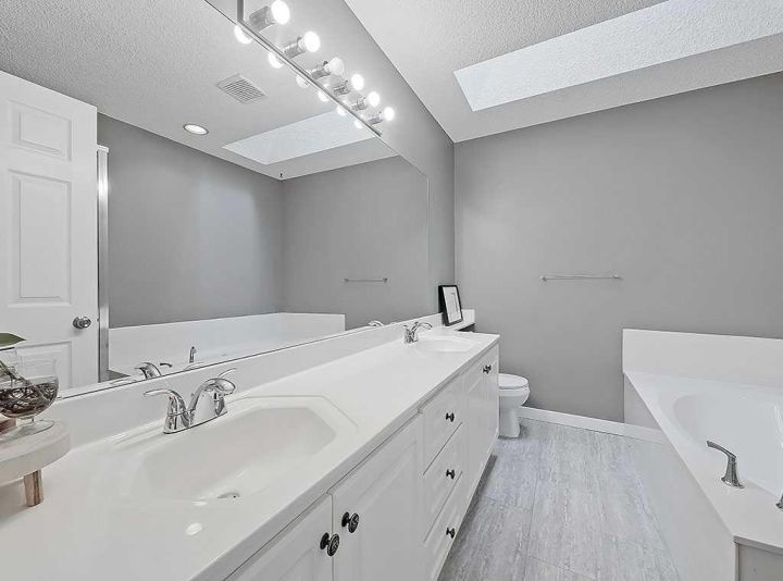 The upper level offers two well-sized bedrooms, each with its own walk-in closet. A beautifully designed 5-piece bathroom separates the bedrooms and includes double sinks, a soaker tub, and a separate shower.