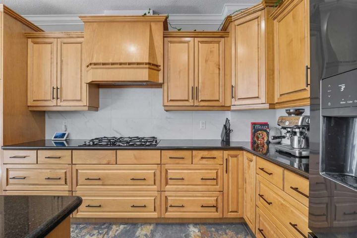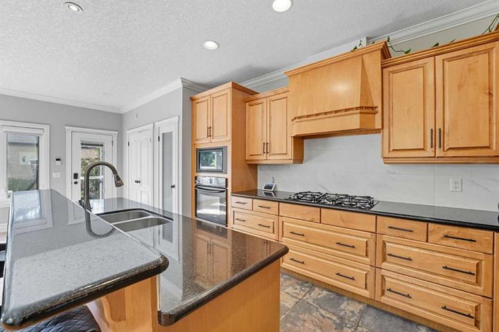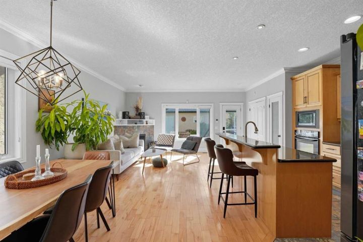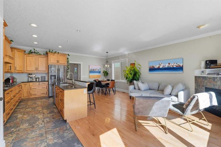 Step inside from the cold to a welcoming front foyer and a bright main-floor office—ideal for working from home or easily used as a guest bedroom. Gleaming hardwood floors lead you into the heart of the home, where a chef-inspired gourmet kitchen invites cozy evenings and effortless entertaining. Warm maple cabinetry, granite countertops, a large central island, and stainless steel appliances including a gas cooktop and built-in oven create a space you’ll want to gather in all winter long. The open-concept dining and living areas are filled with natural light from large south-facing windows, while one of three gas fireplaces adds warmth and ambiance on chilly nights. Step outside to the sunny south-facing deck and fully landscaped, fenced backyard—perfect for hosting when the seasons change.