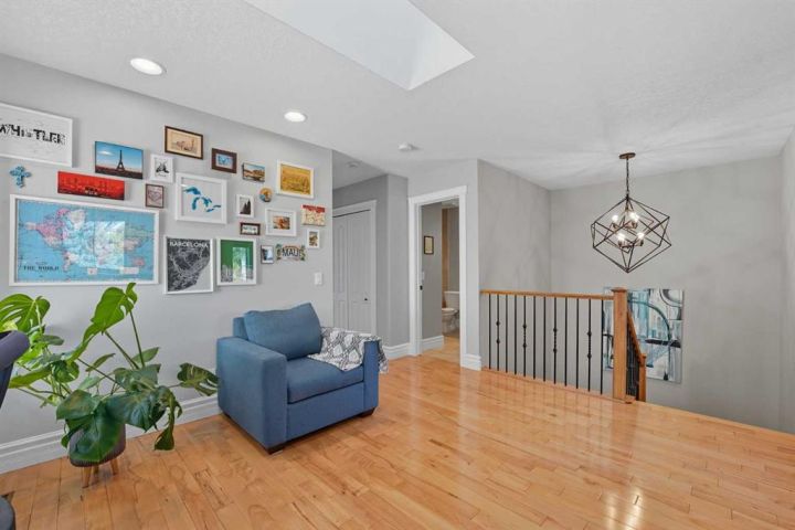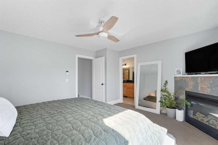 Upstairs, unwind in the spacious primary retreat featuring its own corner gas fireplace, walk-in closet, and luxurious 5-piece ensuite—your private escape from the winter chill. A generous second bedroom includes a charming Juliet balcony, while the open loft with built-in cabinetry is ideal for a reading nook, home office, or warm play space. Skylights and an upper-level laundry complete this bright and functional level.