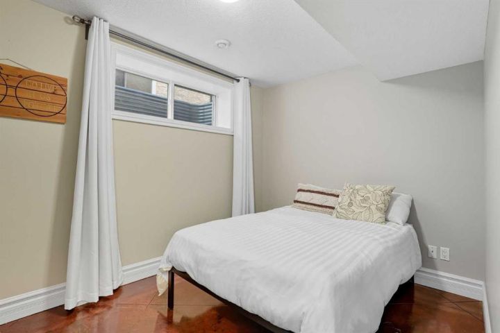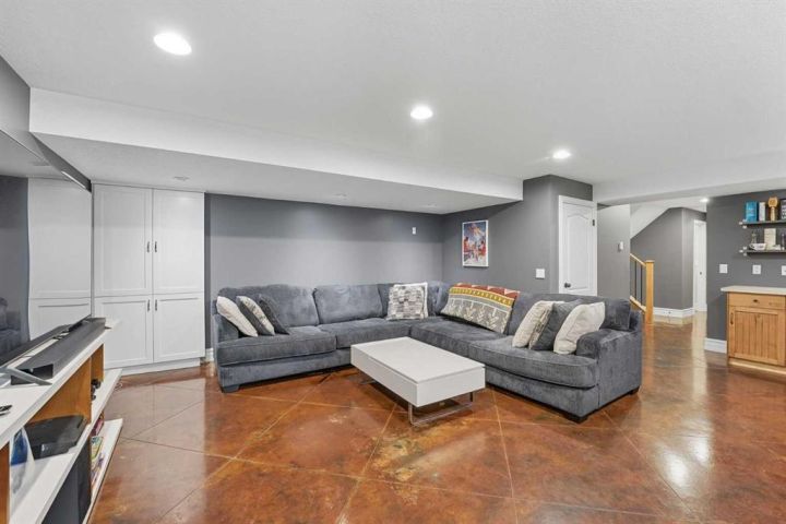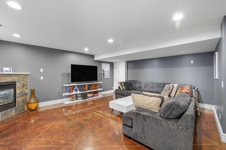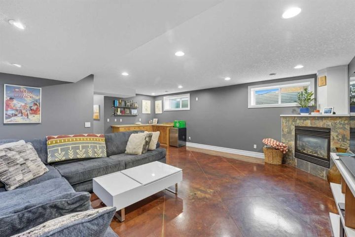 The fully finished basement is designed for comfort and entertaining, featuring heated copper-stained concrete floors, a large family room with a corner wet bar, and a third gas fireplace—perfect for movie nights or gatherings during the coming holiday season. A third bedroom, full 4-piece bathroom, and abundant storage complete the space.