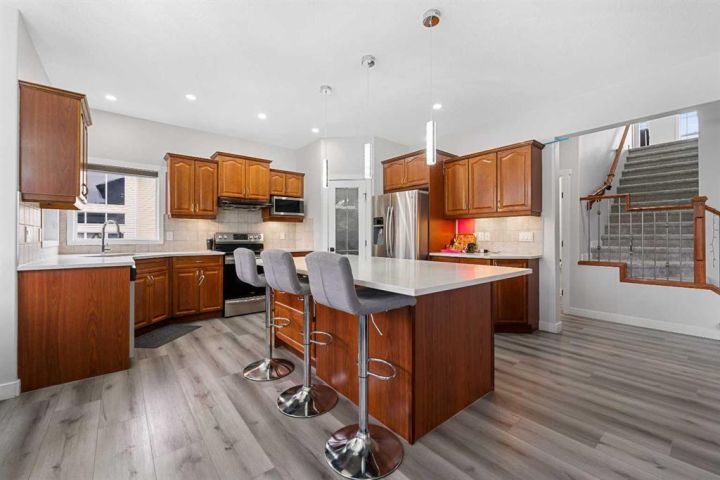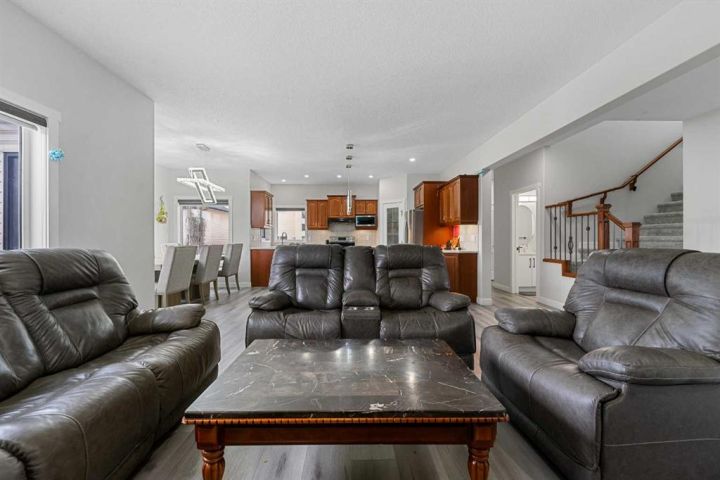 Directly Across From a Park | Seconds to Prairie Waters Elementary School | Quick Walk to Chestermere Lake & All Shopping | Walkout Basement Suite(illegal) | Brand New Blinds | 2 Furnaces & 2 Hot Water Tanks | 2,542 SqFt | Total of 6 Beds & 3.5 Baths | Expansive Living Space | Open Floor Plan | Spacious Kitchen | Quartz Countertops | Stainless Steel Appliances | Extended Kitchen Island with Barstool Seating & Built-in Wine Rack | Walk-through Pantry | Large Windows | Bright Natural Light | Main Level Office | 4 Upper Level Bedrooms | Primary Ensuite with Soaking Jet Tub | Upper Bonus Room | Vaulted Ceilings | Upper Level Laundry Room | Walkout Basement Suite(illegal) | Separate Entry | 2 Basement Beds & 1 Bath | Incredible Backyard | Massive Lawn | Double Attached Front Garage | Driveway. What more could you ask for from this stunning 2,542 SqFt family home in the perfect location! The front door opens to a foyer with with closet space keeping it organized. The main level has great living space with a front family room and a living room with a gas fireplace. The living room open to the kitchen and dining make this the perfect to host friends & family. The kitchen is outfitted with wood cabinets, stainless steel appliances, laminate countertops and a centre island with barstool seating and a built-in wrack. The kitchen has a walkthrough pantry for dry goods storage that connects to the mud room & interior garage door. The dining room overlooks your backyard with large windows letting natural light beam through. The main level office is a bonus for your work-from-home lifestyle. Head upstairs to 3 additional bedrooms grandiose bedrooms a family room with vaulted ceilings & a full laundry room. The primary bedroom is paired with a walk-in closet and private 5pc ensuite with a deep soaking tub, dual vanities & a walk-in shower. Bedrooms 2 & 3 upstairs are both sizeable and share the 4pc bath with a tub/shower combo. The family room is extravagant and comfortable with plush carpet and large windows. The upper level laundry is a treat as its near majority of your bedrooms. Downstairs, the WALKOUT basement is set up as a suite(illegal) with its own separate access at the rear of the home. The open floor plan living room and kitchen provide space for flexible living and dining space. The basement kitchen has cabinets both above & below, stainless steel appliances and laminate countertops. The 2 bedrooms on this level are a great size & share the 3pc bath with a walk-in shower. This lower level has storage and the utility room! Step outside to a massive backyard with plenty of space for the adults to enjoy while the kids play in the park across the street! Your backyard has plenty of room for a large outdoor dining set and more! The location can't be beat; walking distance to Chestermere Lake, the major shopping complex with all amenities and the Prairie Waters Elementary School. Don't miss out, hurry and book your showing at this incredible family home today!