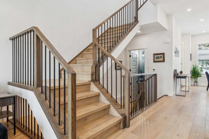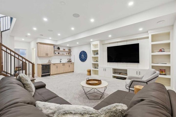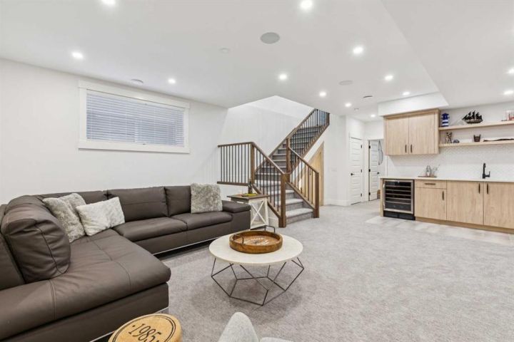 The lower level is your ultimate entertainment zone, featuring comfortable 9-foot ceilings. Prepare to host in style with a fully equipped wet bar, a truly incredible custom-designed wine cellar built directly into the staircase, and integrated built-in speakers for a true theatre experience. This level is completed by a bright and spacious guest bedroom with a walk-in closet and an upgraded bathroom. Located just minutes from downtown, desirable schools, and all essential amenities, this location offers unparalleled urban convenience. Don't miss this opportunity to acquire this spectacular, move-in-ready property. For a better look and more additional information, be sure to view the immersive 3D Virtual Open House Tour and download the full detailed feature list.