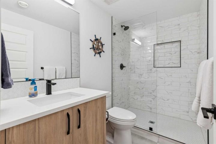 Ascend to the upper floor, which hosts a lavish primary suite designed as a true sanctuary that you won’t want to leave. Here, you'll find detailed ceilings, a HUGE custom walk-in wardrobe, and a spa-inspired ensuite. This retreat indulges you with in-floor heating, an underlit floating vanity with dual sinks, a deep soaker tub, an artistic feature wall, and a luxurious tiled steam shower. This level also features two bright guest rooms, a dedicated second full bathroom, and a generous laundry room with a separate sink and ample built-in storage.