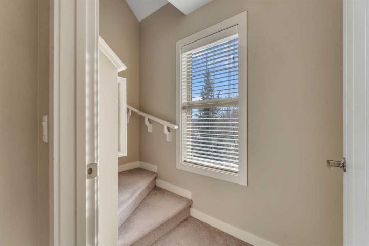 The second floor features two generous bedrooms and a 3-piece bathroom, with well-maintained carpet throughout the upper levels. One of the standout features of this home is the top-floor master bedroom, privately separated and designed with a vaulted ceiling, walk-in closet, and its own 3-piece ensuite. From this level, you can enjoy beautiful mountain views year-round. This home comes with two dedicated parking stalls, offering excellent convenience for homeowners and guests.