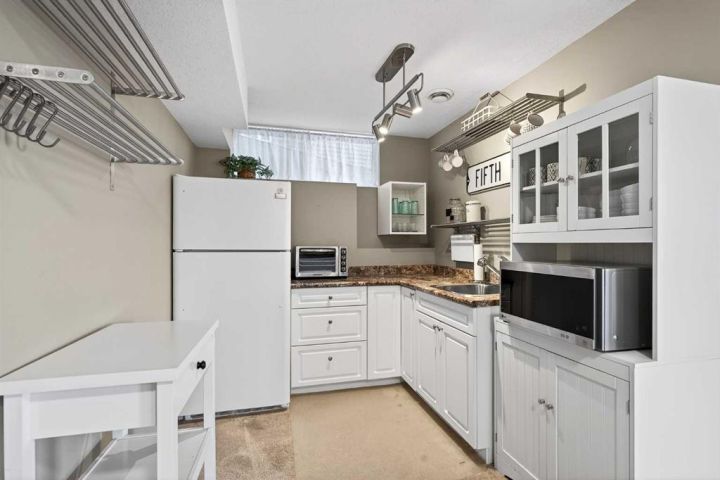 Refrigerator in basement, washer/dryer in basement, hot plate in basement, counter-top convection oven in basement,