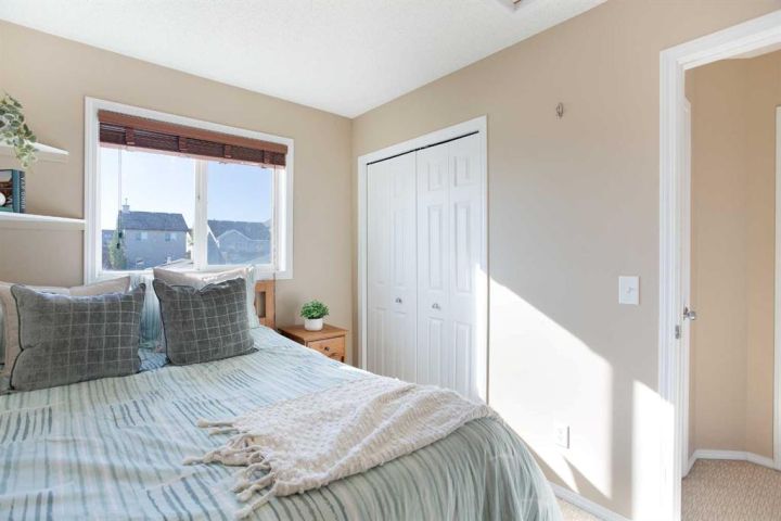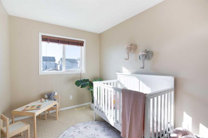 Welcome to refined living in Morningside, a premier Airdrie destination that defines family elegance. Step inside this stunning, meticulously maintained 2-storey home—a glamorous 1,275+ square foot sanctuary where contemporary design meets irresistible comfort. The main floor is an invitation to gather. Light floods the open space, drawing you toward the spacious living room where a cozy gas fireplace provides the perfect atmospheric glow for cool evenings. Prepare to be inspired by the sophisticated, chef-inspired kitchen: rich Hazelnut-stained cabinetry, a substantial central island, and an expansive pantry create a high-end culinary environment. The adjacent dining area provides a flawless setting for both casual family meals and your most elegant dinner parties. Ascend to the quiet upper level, your private sanctuary. The primary suite is a true escape, boasting a large, tranquil space, complemented by a spa-like 4-piece ensuite and an expansive walk-in closet designed to effortlessly organize your finest collection. Two additional, generous bedrooms and a sleek 4-piece main bathroom ensure supreme comfort and privacy for all. Beyond the interiors, discover your sun-drenched, south-facing private oasis. The fully fenced yard features a deck for al fresco dining, beautiful low-maintenance landscaping, mature Haskap berry trees, and the immense convenience of RV PARKING next to the magnificent oversized detached double garage.