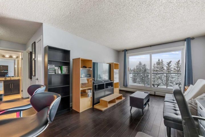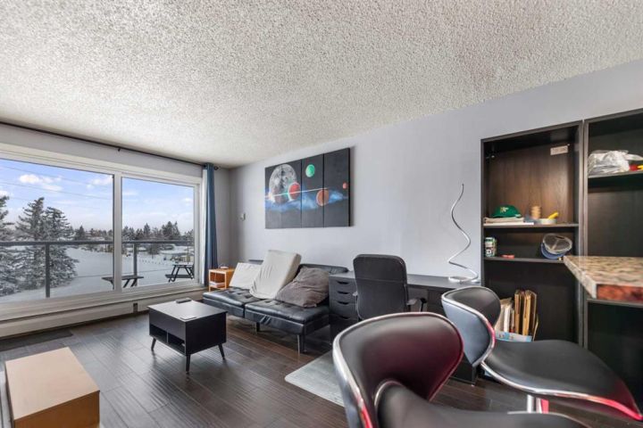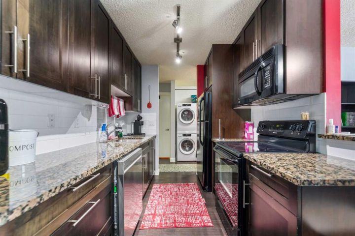 Features include. Black appliances, granite counter tops, shaker style espresso maple cabinets, engineered hardwood flooring with carpeting the bedroom, in-suite laundry ,in-suite storage,. Balcony off living room with west exposure. Call your Realtor to show.