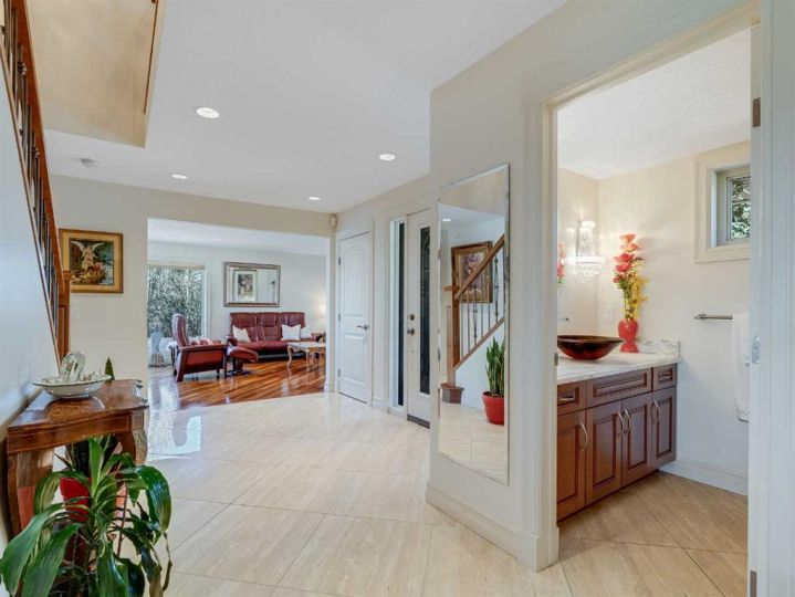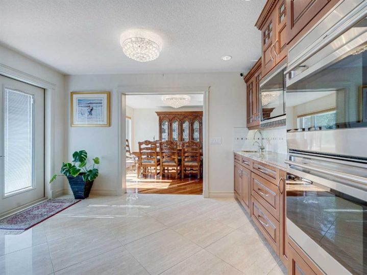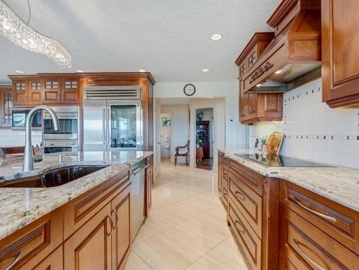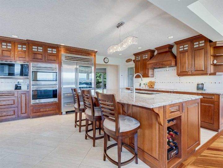 Inside, a grand foyer leads into elegant living and dining areas finished with site-finished Brazilian hardwood. The chef’s kitchen offers custom cabinetry, Sub-Zero/Wolf appliances, exotic granite, induction cooktop, dual wall ovens, porcelain sink, large working/eating island, and a walk-in pantry, with direct access to a spacious view deck ideal for outdoor dining.