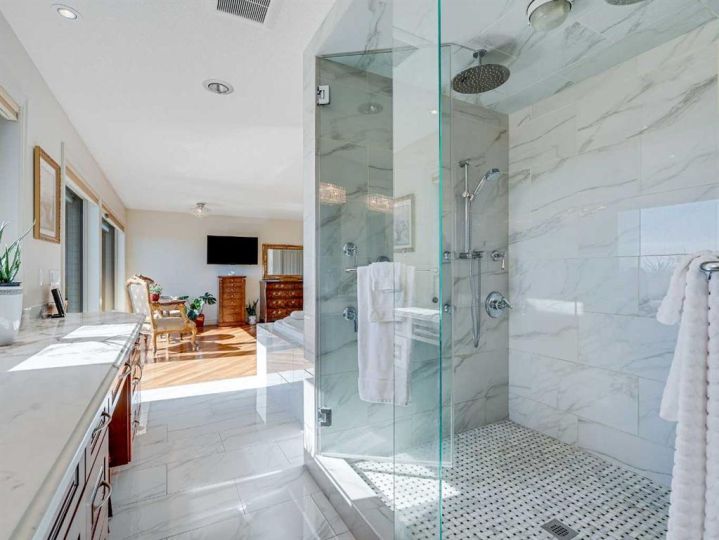 The main floor also includes a private suite with bedroom, bathroom, kitchenette, living area, and separate entrance—perfect for guests, extended family, or a nanny. Upstairs are three bedrooms including a stunning primary suite with panoramic horizon views, spa ensuite, and custom dressing room.
