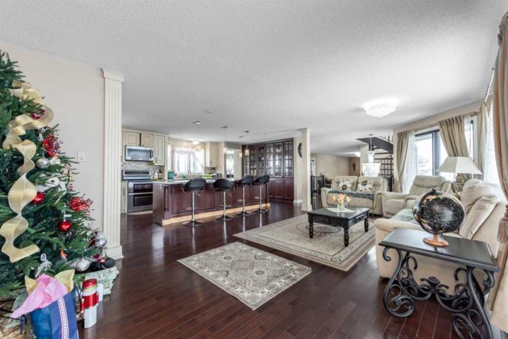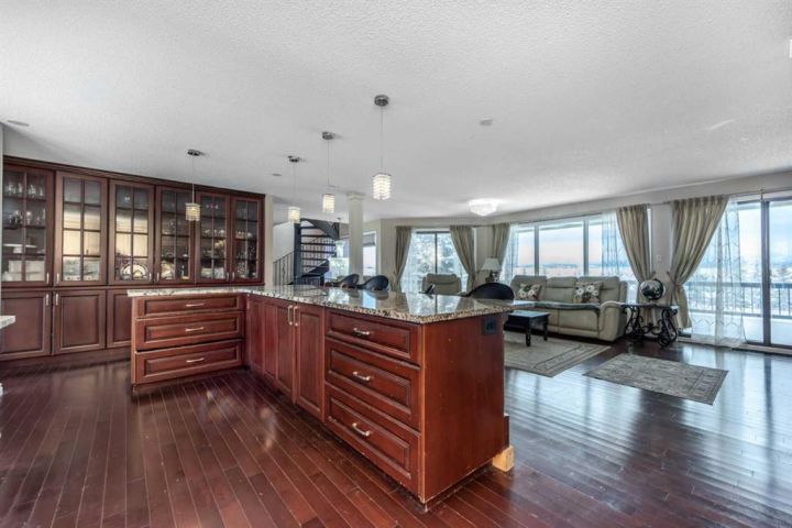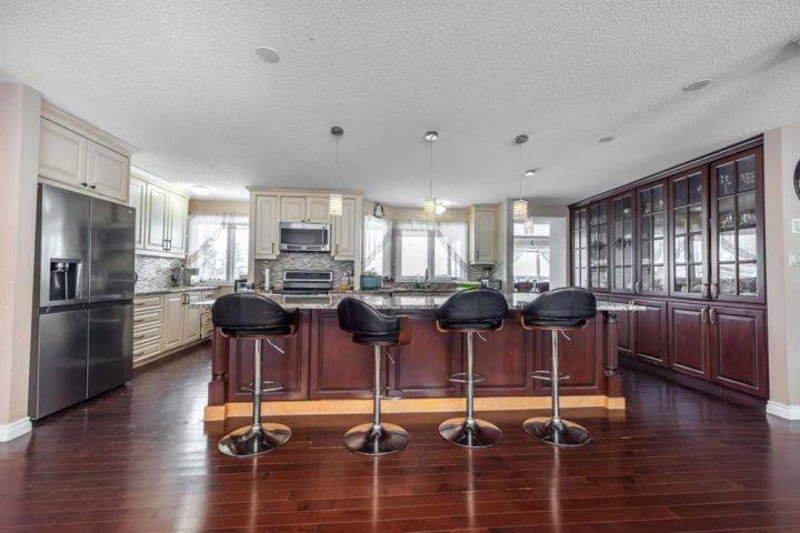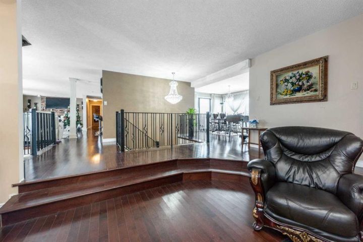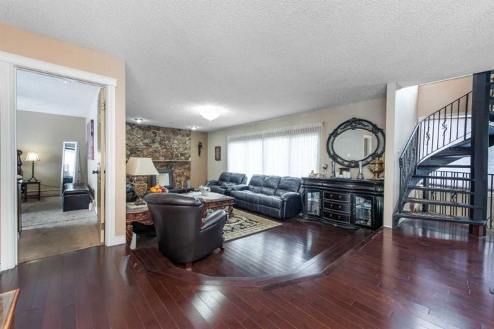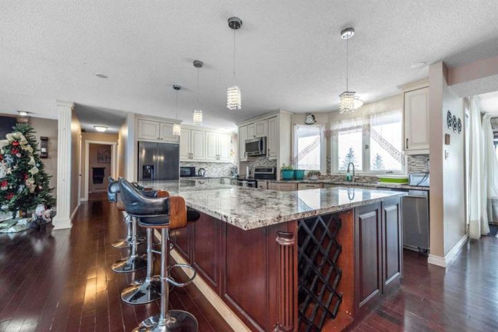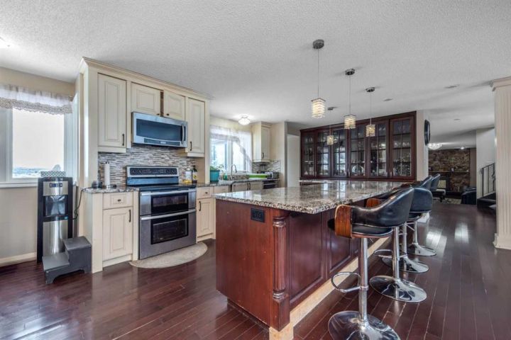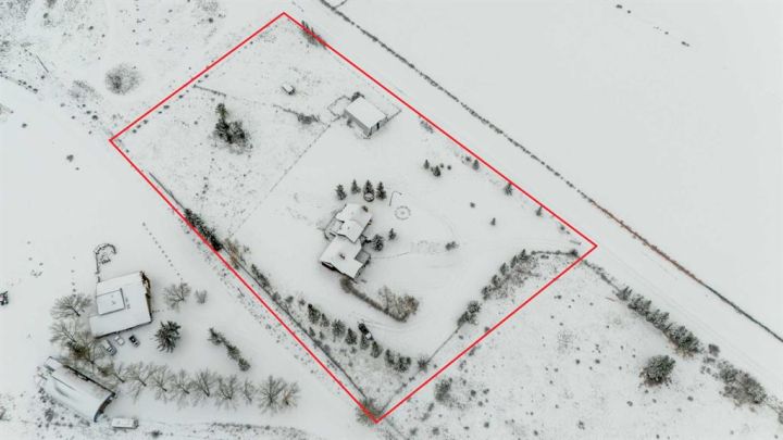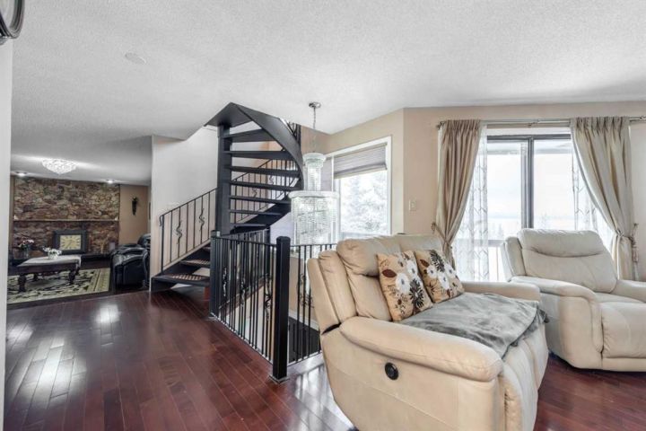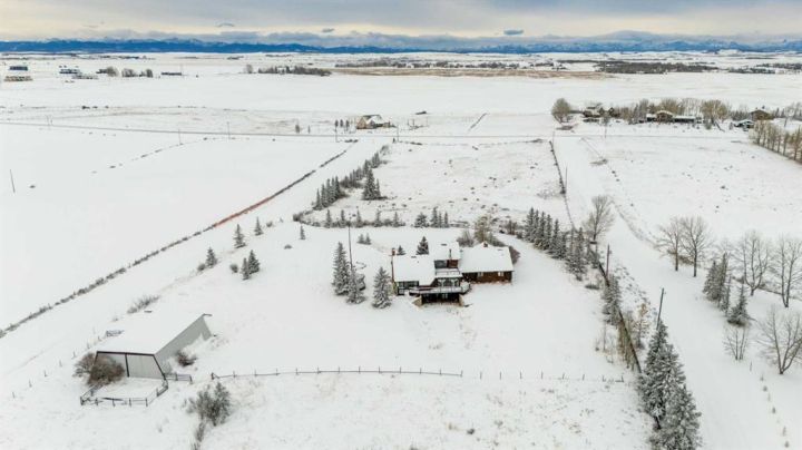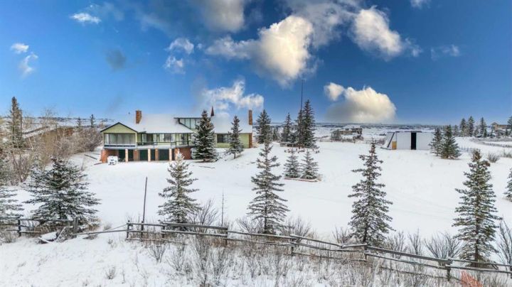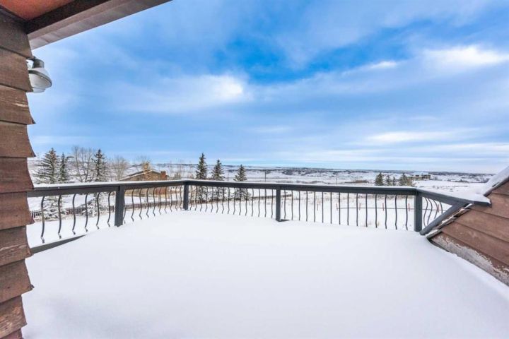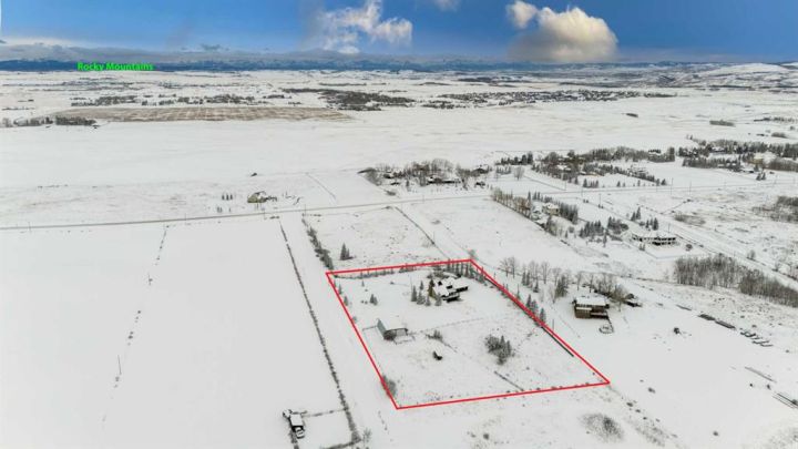 Rare opportunity in sought-after North Springbank! Nearly 4 acres perched on a picturesque knoll with 360° mountain, valley, and city views. This peaceful, private acreage offers gently rolling, fenced land—ideal for families, hobbyists, anyone seeking space, or the perfect lot to build your dream home—all just minutes from the upcoming Bingham Crossing Mall, new Costco, top schools, Springbank Airport, and Springbank Links Golf Course. This reversed walkout, lofted hillside bungalow features a bright open layout, a sunken living room with brick fireplace, formal dining room, spacious kitchen with island, large family room with second fireplace, and 3 bedrooms on the main level. A unique upper office loft accessed by a circular staircase adds extra versatility. Enjoy the massive partially covered west-facing deck plus an additional east deck and balcony. A 3-car heated attached garage with covered carports provides ample parking, along with room for RVs and equipment. The 40’x47’ metal Quonset, offers excellent workshop, storage, or hobby use. This is a prime Springbank location offering quiet country living with outstanding convenience and exceptional long-term potential.