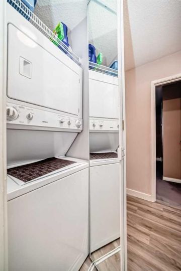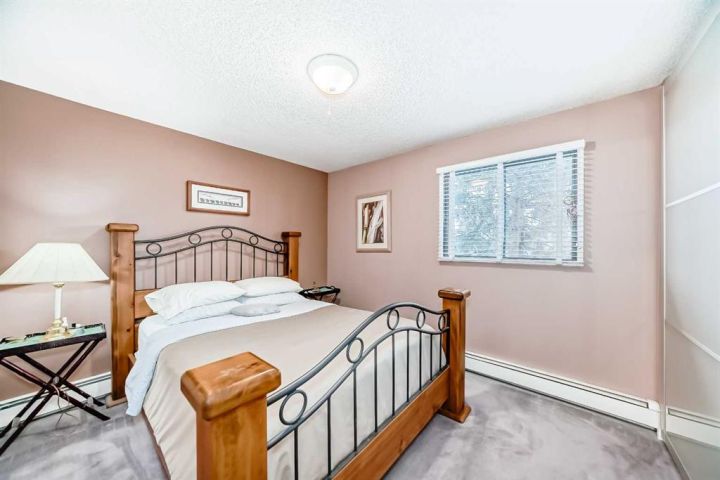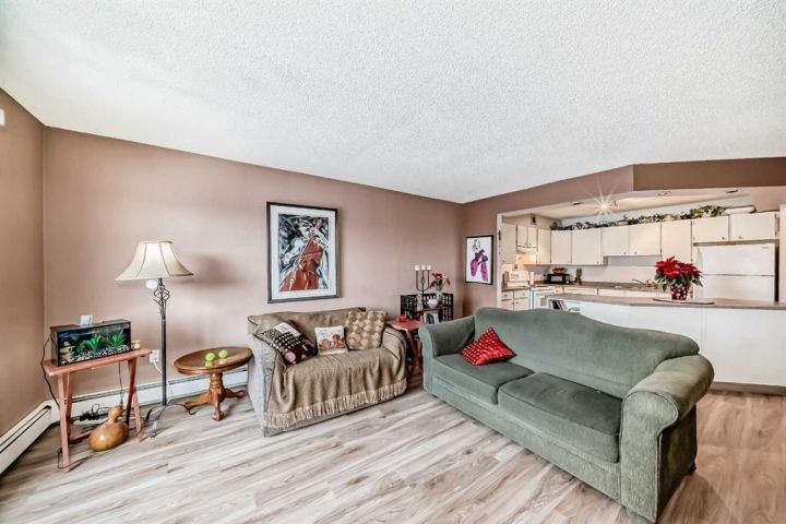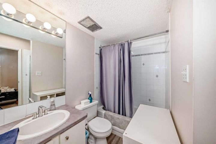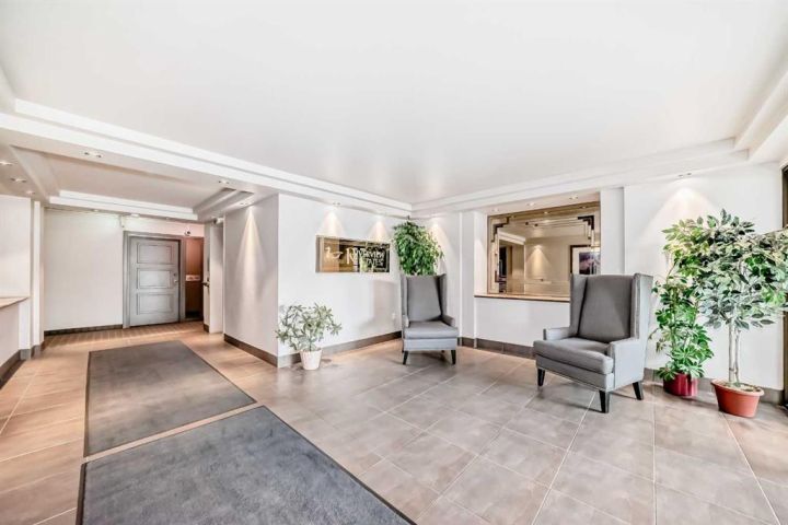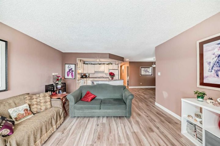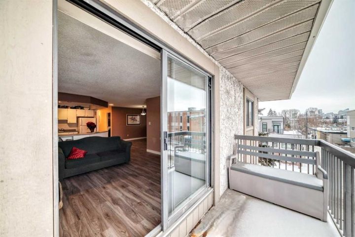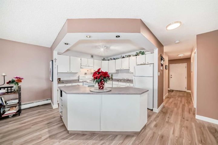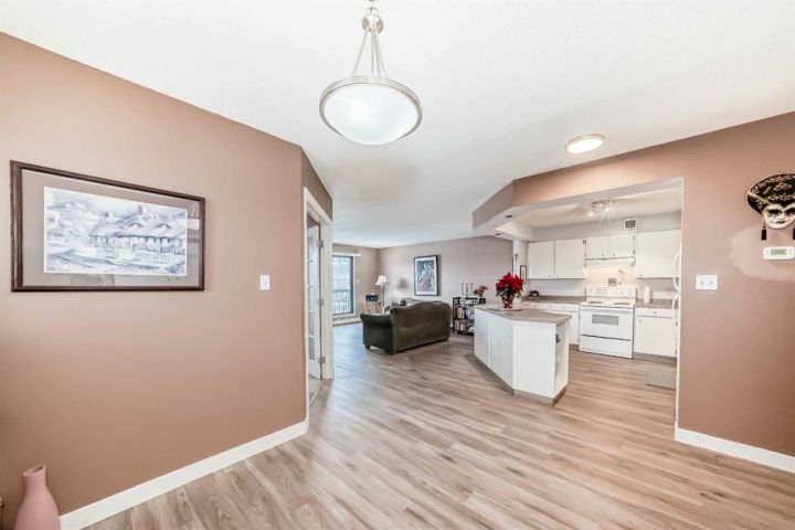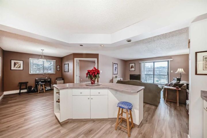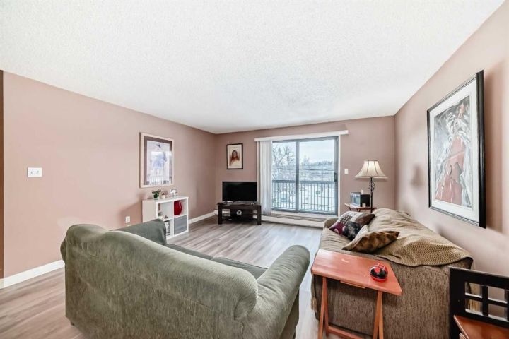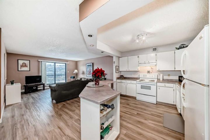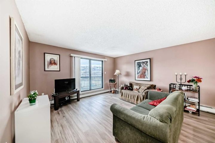 West Hillhurst TOP FLOOR, corner, two bedroom unit in a low rise concrete building with a river view! Super convenient, close to downtown, the University of Calgary, Foothills and Children's Hospitals, and a short commute downtown. Just a short walk or cycle and you're on the Bow River pathway system - less than a block away! Spacious unit (almost 1,000 square feet), with a nice sized south facing balcony and yes there's views of the Bow River. Open concept layout with newly installed LVP flooring (plus new baseboards) and updated lighting in the main living areas. Kitchen is roomy and has a large eat up island with storage AND there's also dedicated space for a dining room. Primary bedroom has a generous closet with tonnes of organizers. Large second bedroom with a mirrored closet and south facing window. This is the only unit in the building with two bathing areas in the bathroom! There's also in-suite storage, a storage locker in front of the parking stall, plus extra storage can be rented if required. Room for everything! Unit comes with an underground heated parking stall and another outside stall can be rented if needed. Riverview Estates is in the process of installing a brand new elevator, plus the fire panel was just upgraded - all well within reserve fund balances. Nearby Sunterra Market and the convenience of the other businesses close by with easy access to everywhere else makes living here a perfect choice!