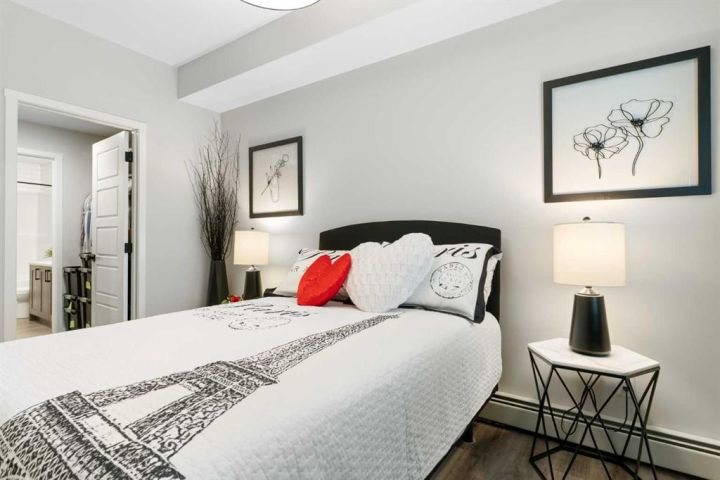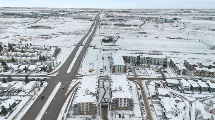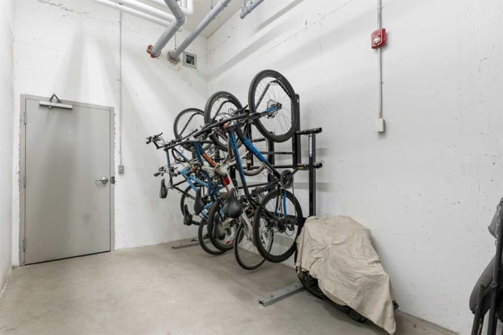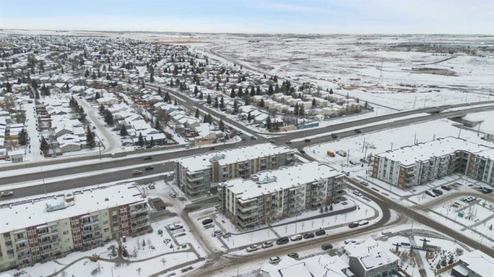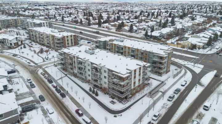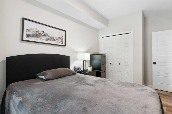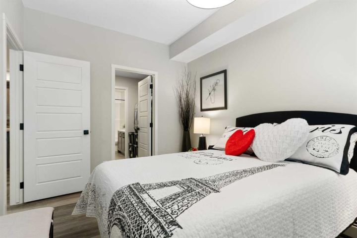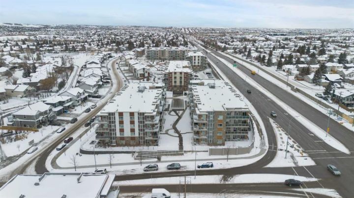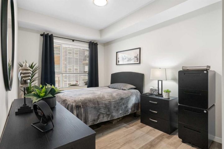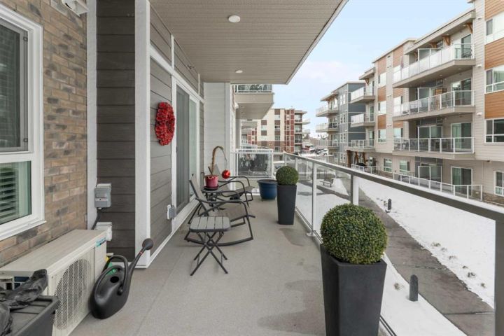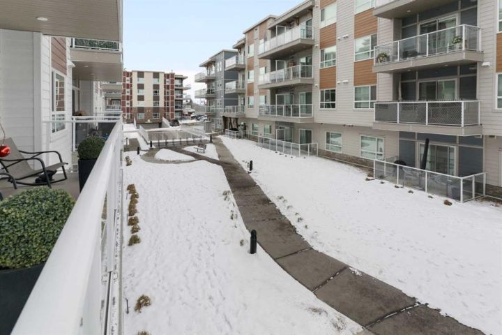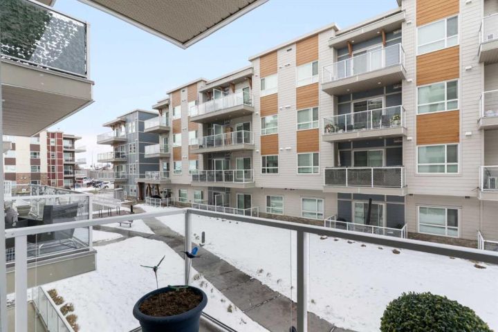 Step into comfort, style, and elevated living in this beautiful 2-bed, 2-bath condo in The Rise at The Parks of Harvest Hills. Built by Cedarglen Homes, and lovingly maintained by its original owners, this home stands out with premium upgrades and central AC for year-round comfort. From the moment you arrive, pride of ownership is evident. The welcoming entry leads into a bright, modern kitchen that makes both everyday cooking and hosting feel special. Featuring a large island with seating, quartz countertops, stainless steel appliances, and a stylish chevron tile backsplash that create a high-end look and feel. Plenty of cabinetry and a pantry give you the storage every homeowner wants without sacrificing clean, contemporary design. Luxury vinyl plank flooring runs throughout the main living spaces for durability and a modern finish. In the dining area, the builder-upgraded built-in adds character and practical storage, making entertaining effortless. The spacious living room has the perfect layout for relaxing, movie nights, or hosting game night with friends. Slide open the patio doors to your oversized private balcony. With room to lounge or dine, built-in exterior lighting, and a BBQ gas line ready to go, this becomes an outdoor extension of your home that you will love from morning coffee to summer evenings. The primary bedroom is tucked away on its own side of the home for privacy and peace. There is plenty of space for a king-sized bed and additional furniture, while the walk-in closet features custom built-ins designed to keep life organized. The 4-piece ensuite is bright, fresh, and calming. It feels like your own personal retreat at the end of a long day. Across the unit, the second bedroom offers flexibility for guests, a roommate, a nursery, or the perfect work-from-home office. The adjacent 3-piece bathroom includes a full-size walk-in shower with upgraded fixtures for a sleek and modern finish. Back near the entry, the laundry room truly sets this home apart. Builder-installed upper cabinets and extra shelving ensure everything has a place and stays clutter-free. A luxury rarely found in condo living. This space also doubles as your front closet with plenty of room for shoes and jackets. Your titled underground parking stall is conveniently just steps from the elevator, making grocery runs effortless. An assigned storage locker and secure bike storage are also included on the same lower level, giving you even more room for the things you love. You are perfectly positioned here. Minutes from the airport, close to Deerfoot and Stoney Trail, and a short stroll to restaurants, local shops, Landmark Cinemas, parks, tennis courts, and schools. Convenience and comfort come together seamlessly. Whether you are downsizing, investing, or purchasing your first home, this upgraded condo offers a level of quality and lifestyle that truly stands out.