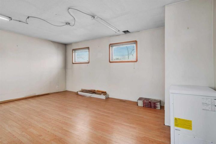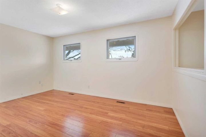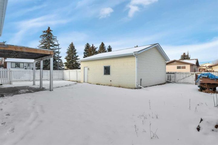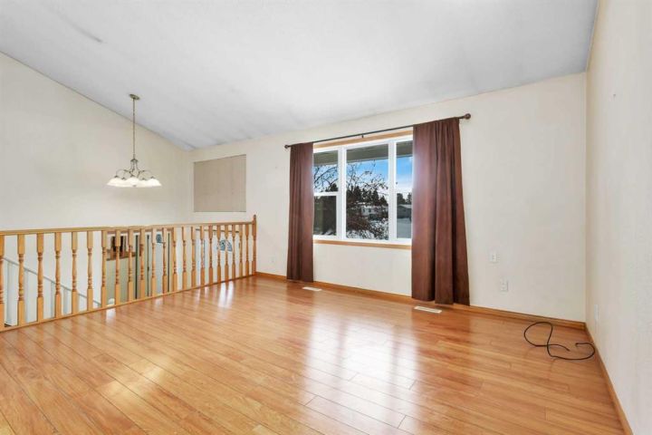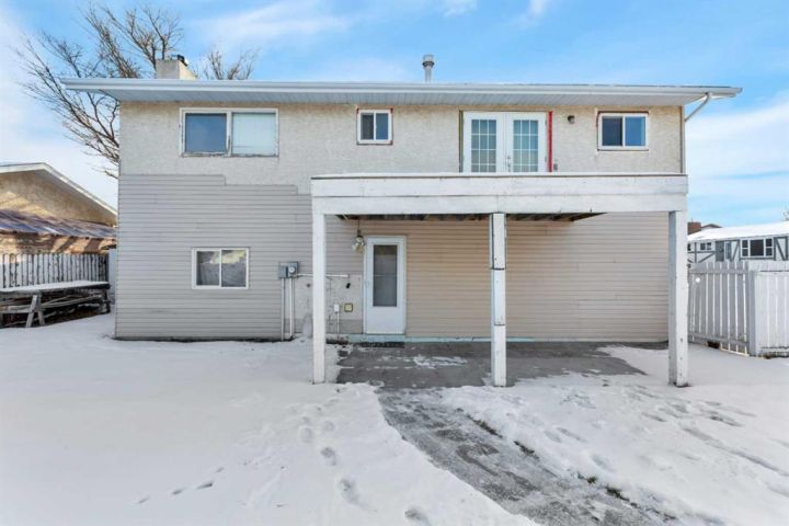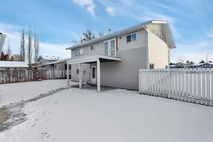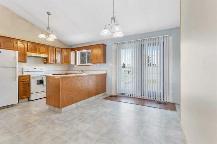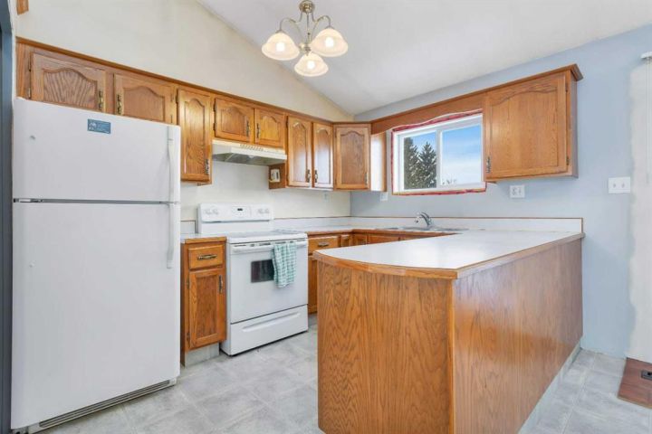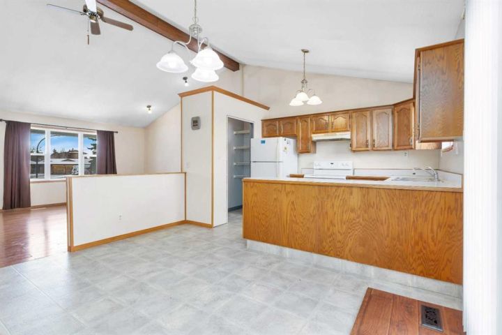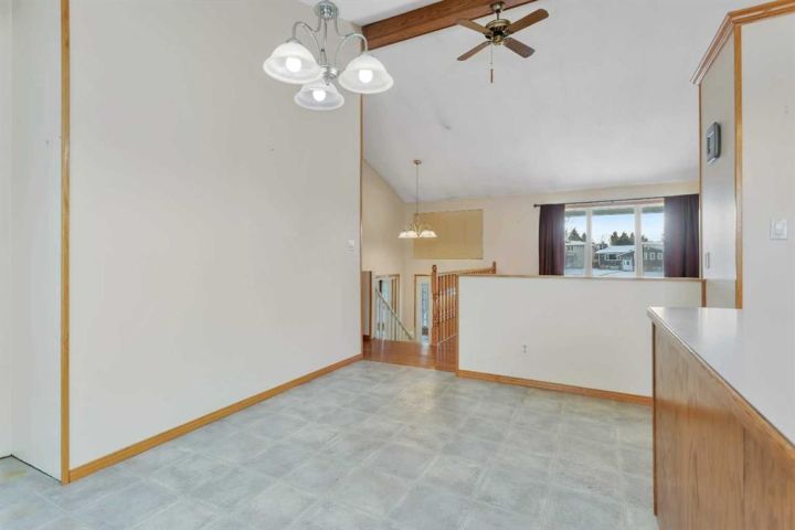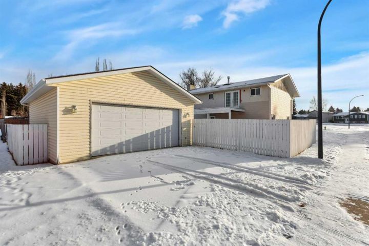 Lots of space and loads of potential! This 3 bedroom + den bi-level sits on a corner lot in a desirable Close with green space in the middle. The front entryway is spacious and the living room and kitchen are bright and open with some new windows and impressive vaulted ceiling. The u-shaped kitchen has lots of counter space and built in pantry. Good dining area with patio doors to back deck. 4 piece bathroom has tiled bath-tub & sky-light and both bedrooms are sized well with a 2 piece ensuite & double closets in the Primary. The basement has a separate entry and 1 bedroom, plus a den (needs a closet) with a 3 piece bathroom. Numerous windows let in lots of natural light and the good sized family room has a wood burning stove. Separate entry boot room area accommodates laundry with shelving and storage. The backyard is fully fenced and the detached garage is oversized with shelving and work benches. Close to shopping and transit and easy highway access!