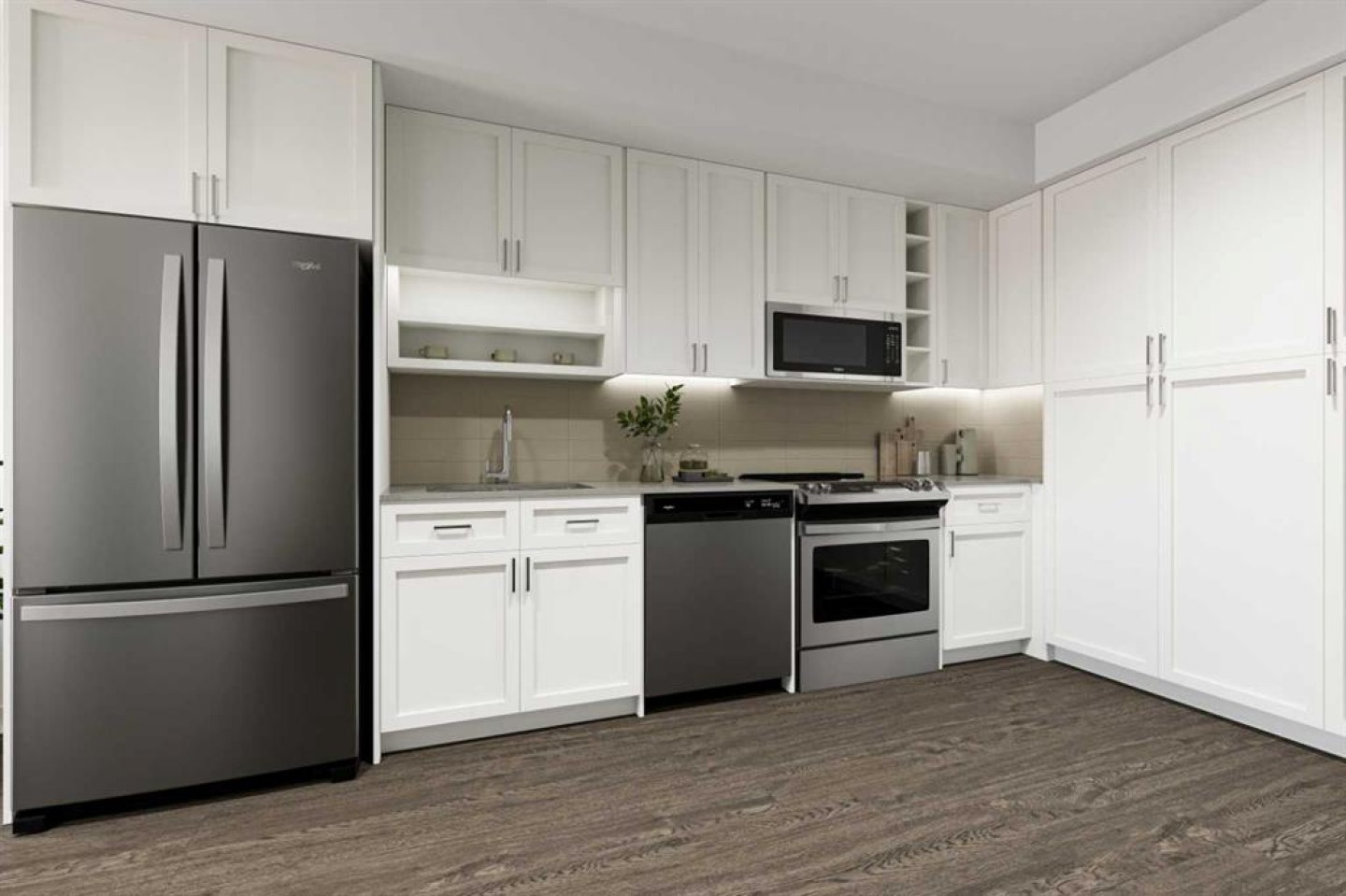 Inside, a curated interior palette featuring quartz countertops, subway tile backsplashes, and sleek hardware. Durable luxury vinyl plank flooring, Whirlpool appliances, and contemporary plumbing fixtures complete the upscale aesthetic. A spacious walk in closet and in-unit laundry make everyday living seamless, while a secure storage locker offers extra room for the things you don’t need every day.