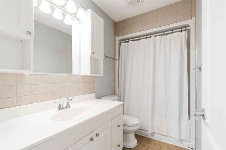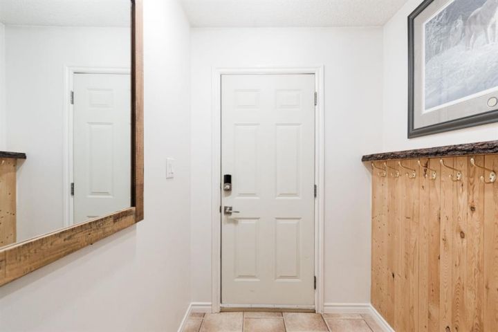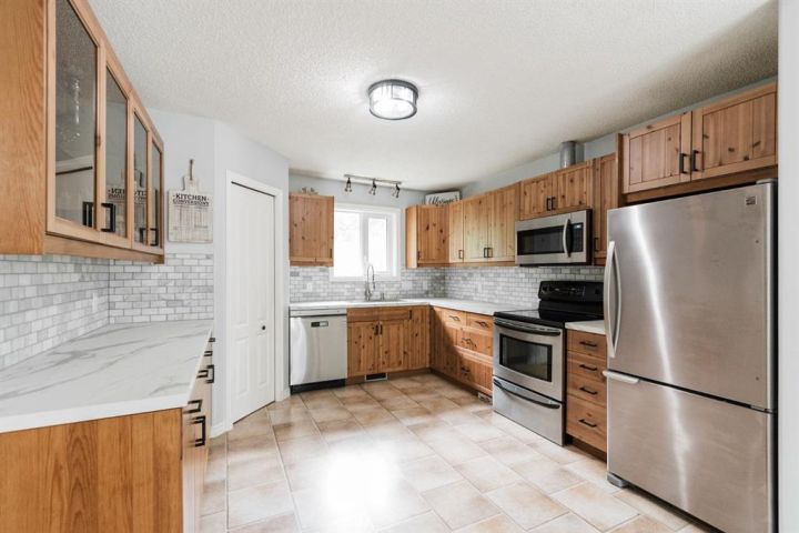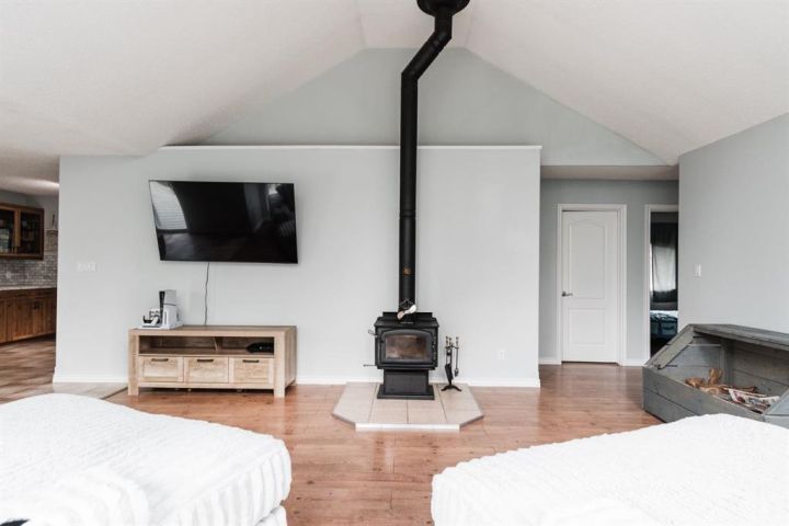 The main level features three generous bedrooms and a four-piece bathroom, all centred around a cozy wood-burning fireplace in the living room—ideal for warming up during Alberta winters.