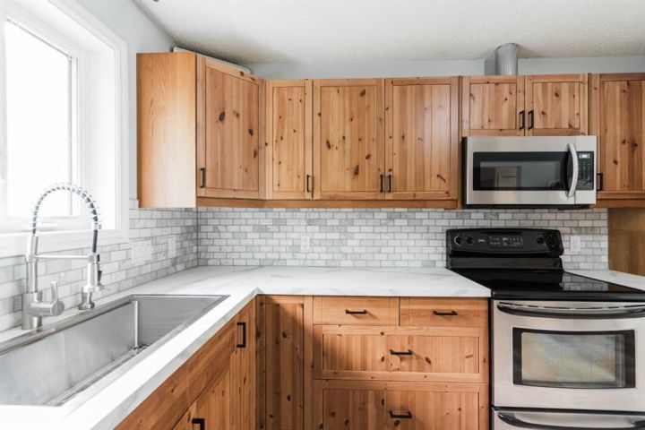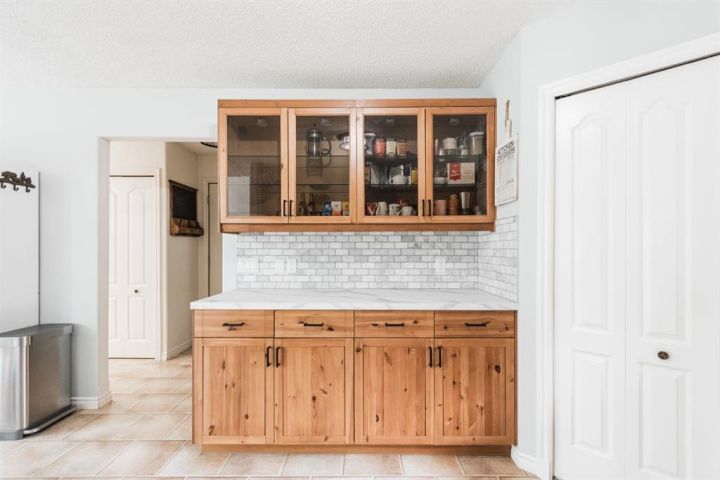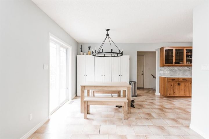 Inside, the home is bright and inviting with stacked windows in the living room that allow natural light to pour in, complemented by fresh light grey paint throughout. The kitchen has been tastefully renovated with warm wood-style cabinetry, new countertops, a striking granite tile backsplash, stainless steel appliances, black hardware, and a corner pantry. A large wagon wheel chandelier adds character above the dining area, tying in modern and rustic charm.
