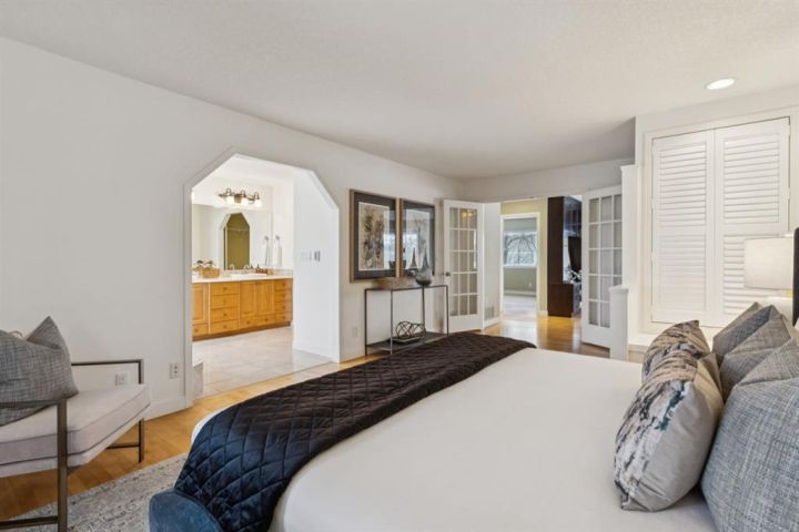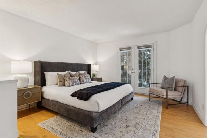 As you ascend to the upper level, you’ll find an enormous den featuring its own fireplace, providing additional versatile space for lounging or working from home. The primary bedroom retreat is a true sanctuary, complete with French doors, a spacious 5-piece ensuite bathroom with heated floors, and a generous walk-in closet, ensuring comfort and privacy.