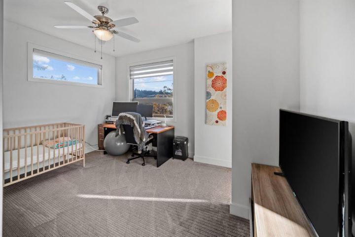 Upstairs, an extra-wide staircase leads to a bright loft area and an impressive primary retreat complete with two walk-in closets and downtown skyline views. The spa-inspired ensuite offers dual vanities, a large glass shower, and a statement soaker tub — your own private escape at the end of the day. A second upper bedroom is filled with natural light and opens to its own private balcony.