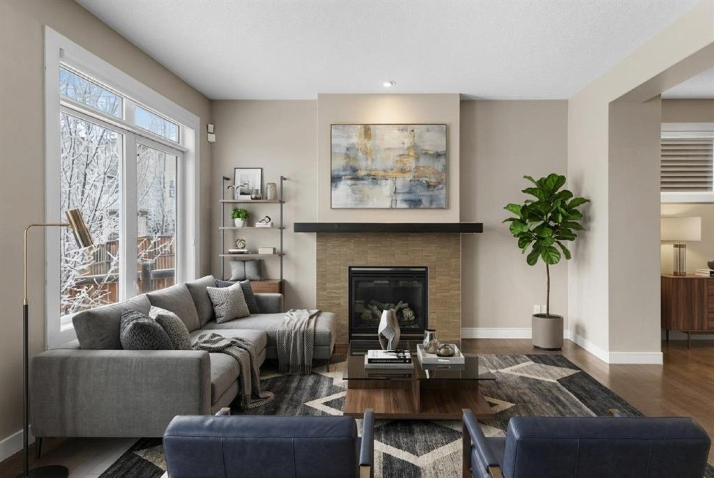 At the heart of the home is a gourmet chef’s kitchen, beautifully appointed with full-height custom cabinetry, high-end stainless-steel appliances, a waterfall-edge granite island, and a walk-through pantry connecting directly to the mudroom for everyday functionality. The adjoining dining area opens to a sun-drenched living room anchored by a sleek gas fireplace—creating the perfect backdrop for dinner parties, holiday gatherings, and quiet evenings at home.
