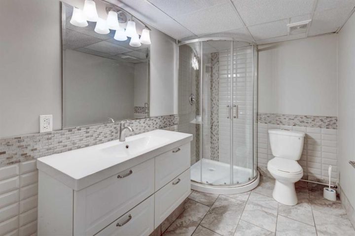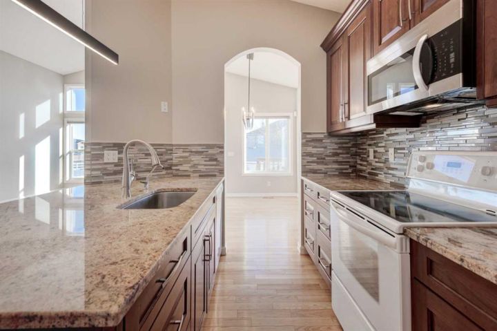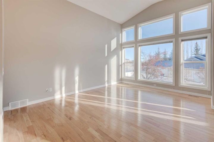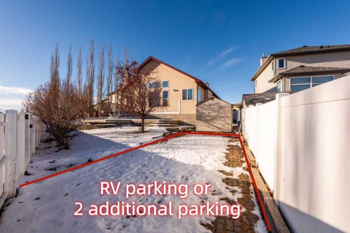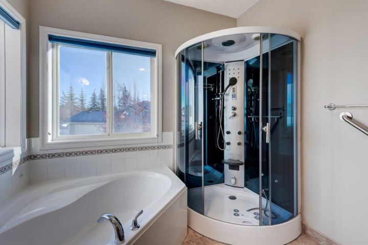 Welcome to this Bright and Spacious bungalow (1,337 sf) with total 4 bedrooms 2.5 baths in desirable West Springs SW, situated on a rare oversized pie lot over 600 sq. meters. Open-concept main floor features vaulted ceilings up to 13 ft, expansive windows, and abundant natural light throughout the kitchen, dining, and living areas. Main level includes two bedrooms, highlighted by a large vaulted primary suite with a luxury ensuite featuring a soaker tub and steam shower with multi-jets. Convenient main-floor laundry and 2-piece bath. Fully developed lower level offers two large bedrooms, a full bathroom, and spacious (over 400 sf) family/recreation room. Outside boasts a huge private lot with mature and fruit trees, no-maintenance vinyl fencing, gated back lane access with RV parking supported by paving stones, and a front-drive attached double garage, total 6 parking spaces. Walking distance to Calgary French & International School, parks, schools, and nearby amenities. Ideal for families and downsizers.