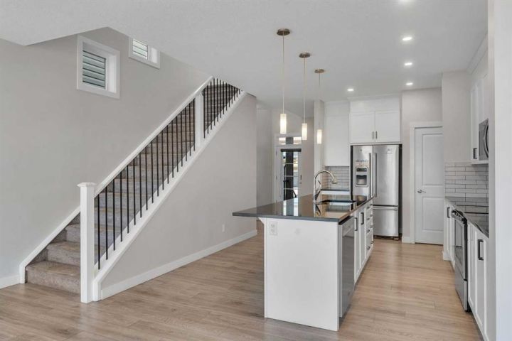 OVER 3100 SQFT LIVING SPACE | WALKOUT BASEMENT WITH KITCHEN & LAUNDRY ROUGH-INS | VAULTED CEILINGS | WEST-FACING LOT | CITY APPRAISAL VALUE $845K | CENTRAL A/C | MAIN FLOOR OFFICE | STEPS TO PARK & POND Welcome to this beautifully maintained 4-bedroom, 3.5-bathroom home tucked away on a quiet street in the heart of Sage Hill. Offering over 3100 sq. ft. of total living space, this property combines smart functionality with modern upgrades and elegant finishes—perfect for families seeking comfort and convenience. Main Floor Bright open-concept layout with 9-ft ceilings and upgraded laminate flooring. Spacious living room with a cozy fireplace and large windows bringing in natural light. Chef’s kitchen with a long granite island, sleek white cabinetry, stainless steel appliances, and upgraded backsplash. Main floor office near the entrance, ideal for remote work or study. Convenient 2-pc powder room. Upper Level 3 generous bedrooms plus a large bonus room with vaulted ceiling. Convenient upstairs laundry room. The primary suite offers a vaulted ceiling, spa-like 5-piece ensuite, and a large walk-in closet. Walkout Basement (Builder Finished) Oversized recreation room, perfect for family gatherings or movie nights. Additional bedroom and 4-pc bath, great for guests or multi-generational living.Kitchen sink and washer/dryer rough-ins. Additional Features Centralized A/C for year-round comfort. Modern lighting, LED pot lights, and knock-down ceilings. West-facing backyard, just steps from scenic parks and a tranquil pond. This move-in-ready home offers the perfect balance of space, style, and investment potential in one of NW Calgary’s most desirable communities. Disclosure: Some of the pictures in the listing has been virtually staged.
