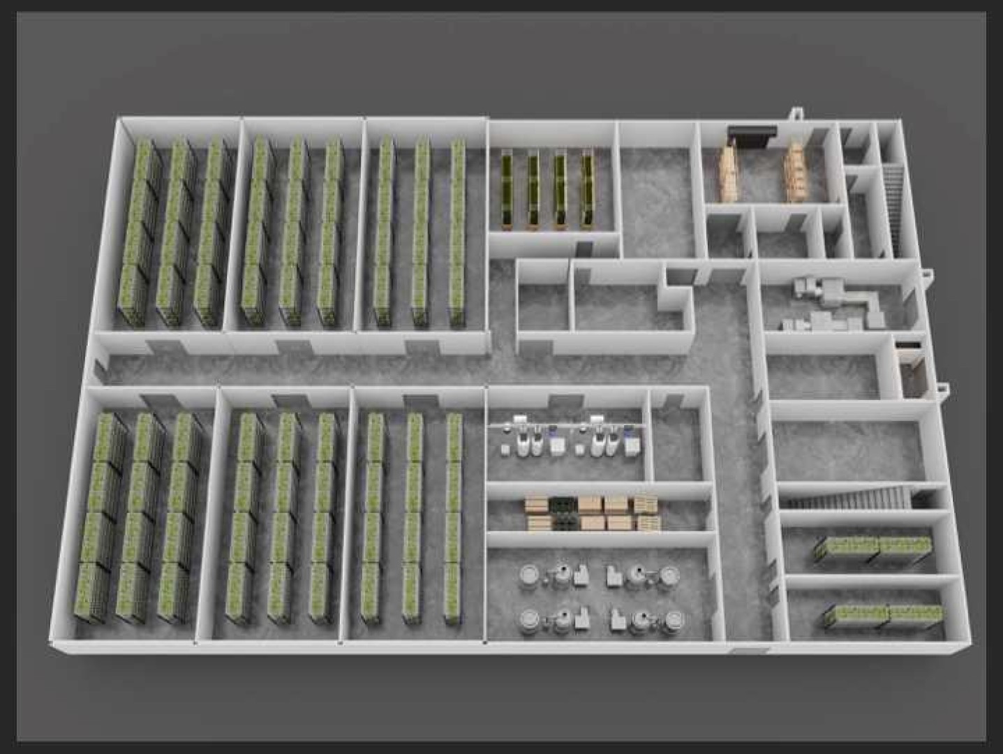 The construction quality is exceptional, featuring a metal clad and Hardie Board exterior with a durable torch-on roof. The building envelope is highly efficient, utilizing R-31 spray foam ceiling insulation and R-25 exterior walls. Inside, the growing and propagation areas are built with steel beam and column construction and MGO engineered wall panels. These specialized MGO walls are highly fire-resistant, capable of resisting fire for up to 2–3 hours and staying unburned at 800°C. They are also water-stable and anti-microbial, preventing issues like mold, mildew, or rot. To further ensure a sterile and bright environment, the interior is finished with Trusscore polymer wall and ceiling panels that are scratch-resistant, moisture-proof, and highly light-reflective.