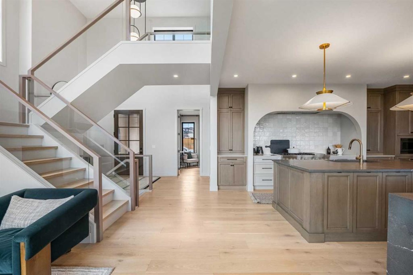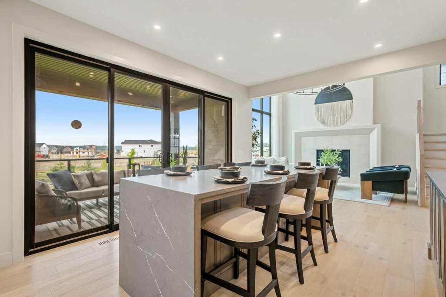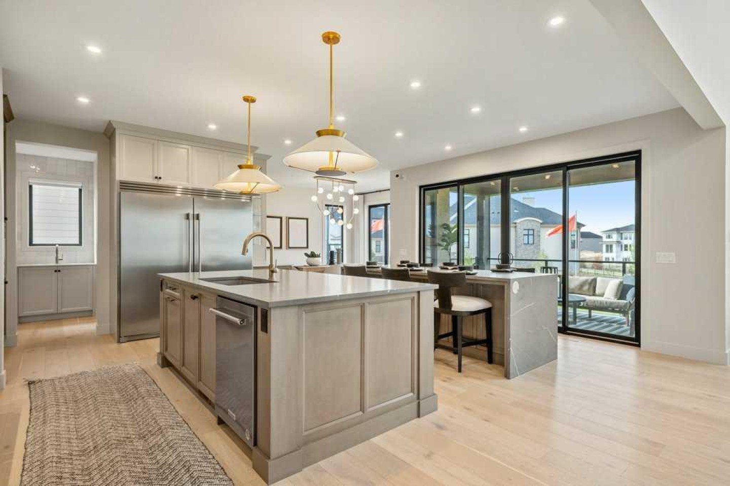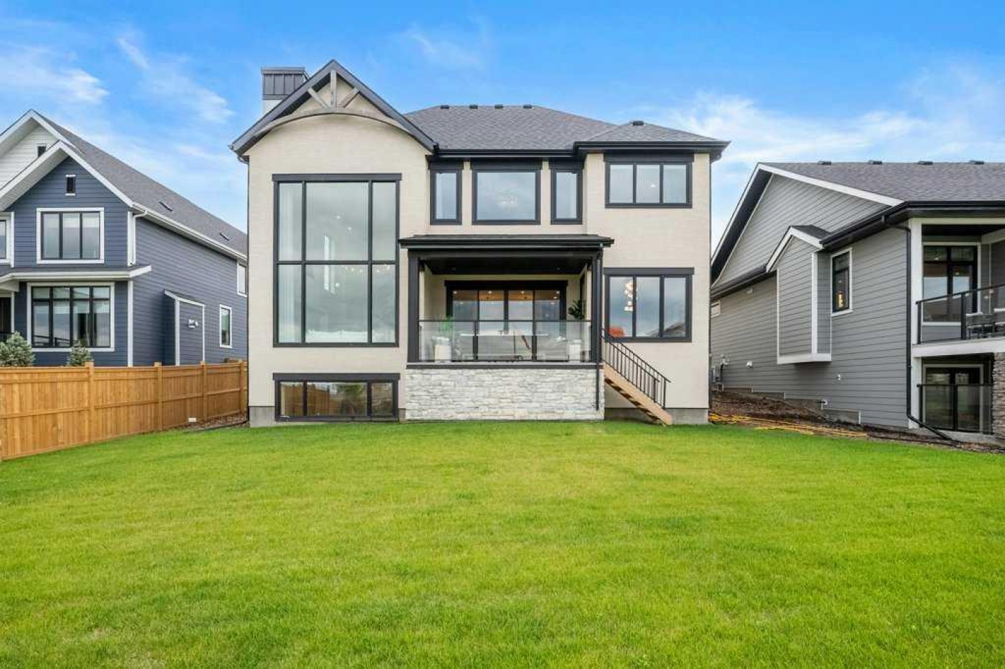 Lake side living at its finest! Presenting the Scarlett Show Home built by Baywest Homes. Ideal for the modern family at just over 5,000 square feet of total developed space, featuring 4 bedrooms, plus generous living and gathering spaces all wrapped in an abundance of style, design and the over-the-top upgrades you would expect in Harmony Estates. Gemstone lighting, a triple front garage, central air, custom window treatments and lighting, a grand open to above, covered deck, 4 full baths, a gym, butlers pantry, generous size mudroom and enclosed front den. Enter into engineered flooring, dual island concept in the kitchen within the themed concept of entertaining and hosting, side by side professional fridge, freezer and gas stove. Built in's throughout the main floor space including the dining area, butlers pantry, den and lower level recreation room. The 'WOW' factor offered from the open to above lifestyle room with its focal 2 story fireplace offers natural light throughout this space. The family convenience of a spacious mudroom located off the butlers pantry, secondary pantry with a corridor hall connecting the front foyer hidden behind the stunning main floor design. An upper floor created for personal space, but welcoming to all. The 3 upper bedrooms situated to the front of the home smartly designed with a 5-peice Jack and Jill en-suite opposite the 3rd bedroom with its own private 4-peice en-suite bath. The laundry area is located just off the bridge access to this level and rests beside the vaulted bonus room. Dual door access to the rear primary bedroom overlooking the green space and walking paths with heated floors in the 5-piece en-suite bath, a full size shower, soaker tub, full width vanity, his and her sinks, an abundance of storage giving off the 5 star hotel vibes from the hanging mirrors to the faucets and fixtures. A lower level for room to relax and gather with a recreation room, wet bar, 5th bedroom and a pocket door to the 4-piece lower bath from the curated gym space. Your outdoor space has a covered deck with access to the walking paths, a short trip to current and future local amenities as well as the beach club, Launchpad and Mickelson National Golf Course.