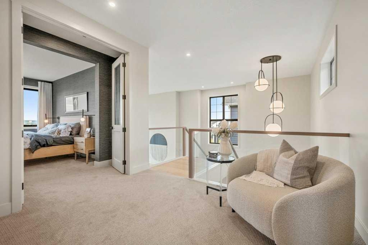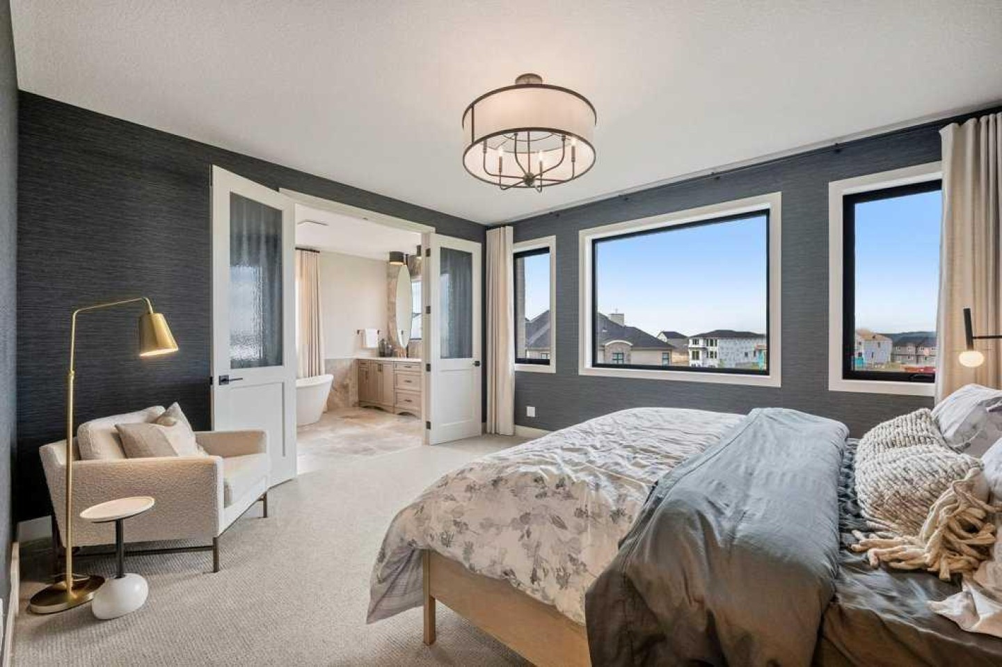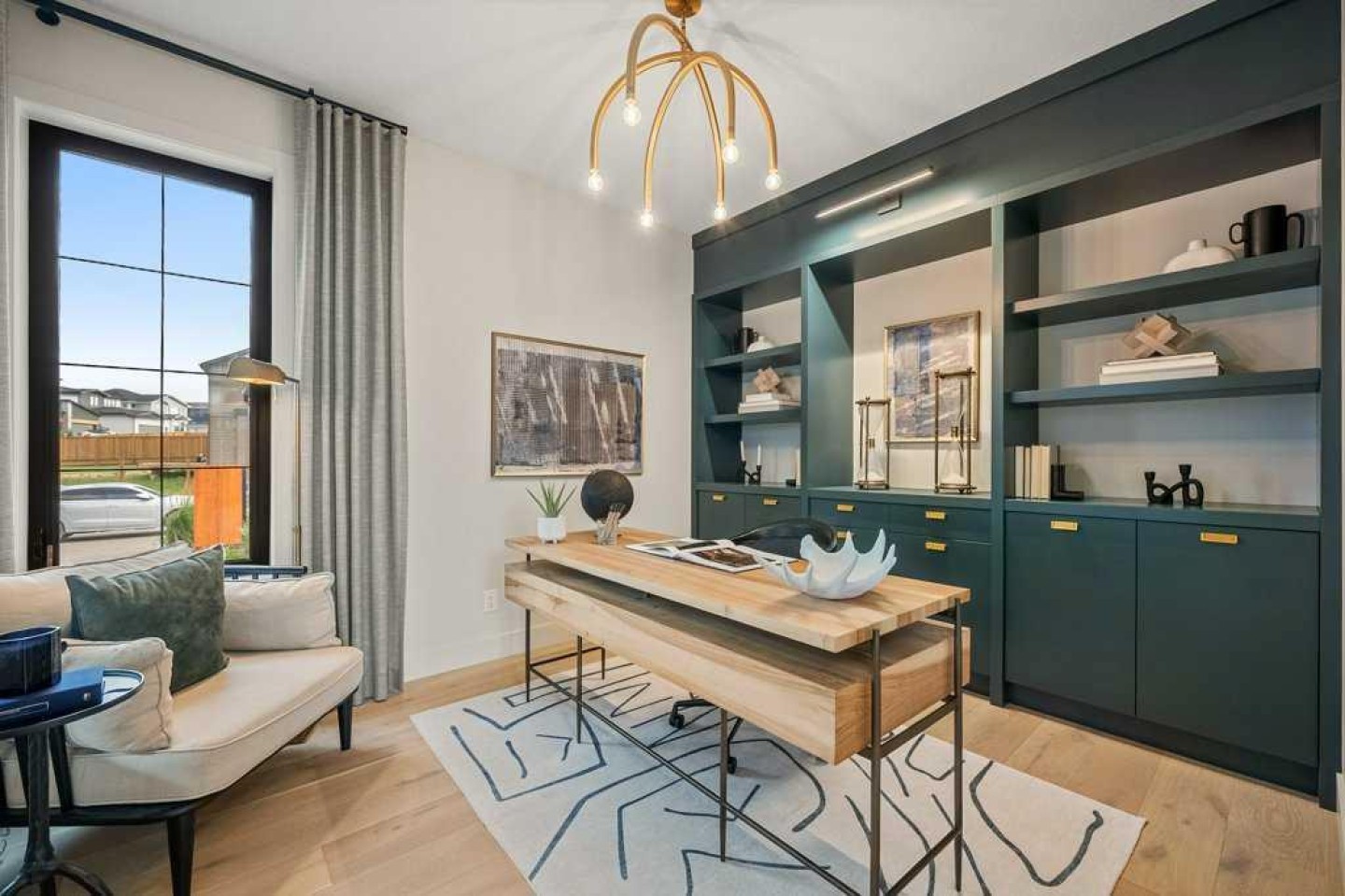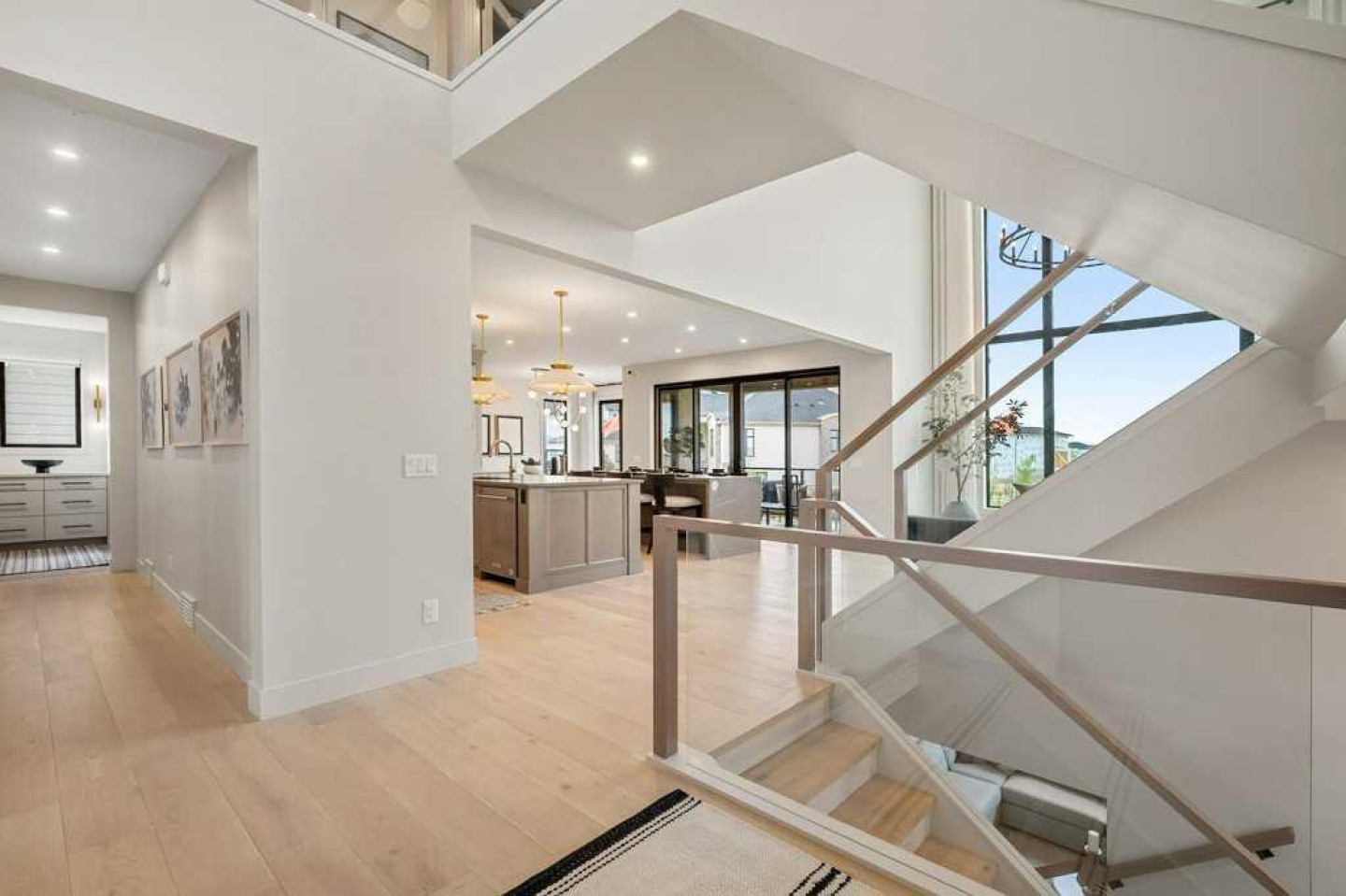 Lake side living at its finest! Presenting the Scarlett Show Home built by Baywest Homes. Ideal for the modern family at just over 5,000 square feet of total developed space, featuring 4 bedrooms, plus generous living and gathering spaces all wrapped in an abundance of style, design and the over-the-top upgrades you would expect in Harmony Estates. Gemstone lighting, a triple front garage, central air, custom window treatments and lighting, a grand open to above, covered deck, 4 full baths, a gym, butlers pantry, generous size mudroom and enclosed front den. Enter into engineered flooring, dual island concept in the kitchen within the themed concept of entertaining and hosting, side by side professional fridge, freezer and gas stove. Built in's throughout the main floor space including the dining area, butlers pantry, den and lower level recreation room. The 'WOW' factor offered from the open to above lifestyle room with its focal 2 story fireplace offers natural light throughout this space. The family convenience of a spacious mudroom located off the butlers pantry, secondary pantry with a corridor hall connecting the front foyer hidden behind the stunning main floor design. An upper floor created for personal space, but welcoming to all. The 3 upper bedrooms situated to the front of the home smartly designed with a 5-peice Jack and Jill en-suite opposite the 3rd bedroom with its own private 4-peice en-suite bath. The laundry area is located just off the bridge access to this level and rests beside the vaulted bonus room. Dual door access to the rear primary bedroom overlooking the green space and walking paths with heated floors in the 5-piece en-suite bath, a full size shower, soaker tub, full width vanity, his and her sinks, an abundance of storage giving off the 5 star hotel vibes from the hanging mirrors to the faucets and fixtures. A lower level for room to relax and gather with a recreation room, wet bar, 5th bedroom and a pocket door to the 4-piece lower bath from the curated gym space. Your outdoor space has a covered deck with access to the walking paths, a short trip to current and future local amenities as well as the beach club, Launchpad and Mickelson National Golf Course.