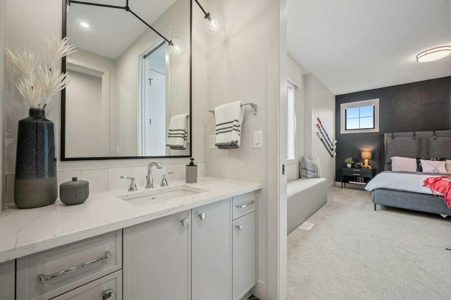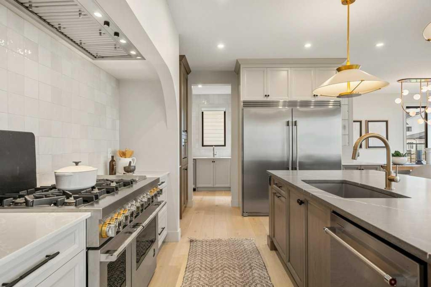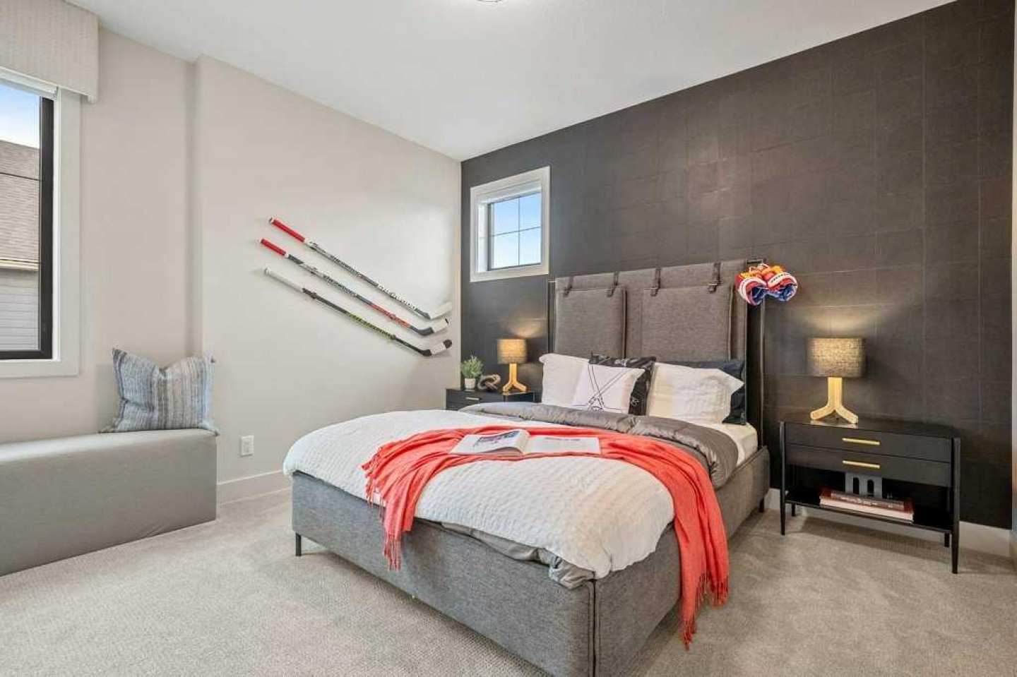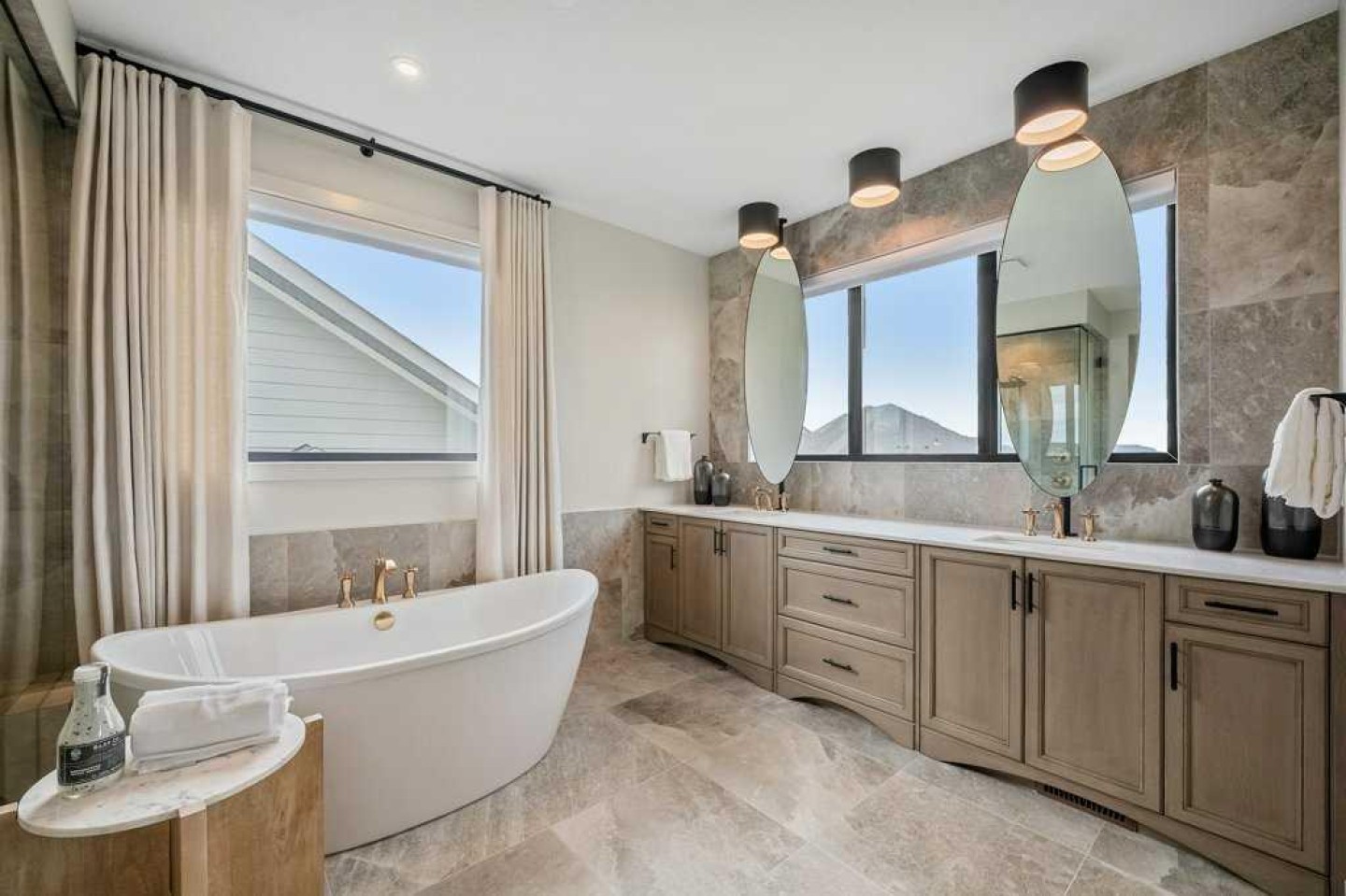 Lake side living at its finest! Presenting the Scarlett Show Home built by Baywest Homes. Ideal for the modern family at just over 5,000 square feet of total developed space, featuring 4 bedrooms, plus generous living and gathering spaces all wrapped in an abundance of style, design and the over-the-top upgrades you would expect in Harmony Estates. Gemstone lighting, a triple front garage, central air, custom window treatments and lighting, a grand open to above, covered deck, 4 full baths, a gym, butlers pantry, generous size mudroom and enclosed front den. Enter into engineered flooring, dual island concept in the kitchen within the themed concept of entertaining and hosting, side by side professional fridge, freezer and gas stove. Built in's throughout the main floor space including the dining area, butlers pantry, den and lower level recreation room. The 'WOW' factor offered from the open to above lifestyle room with its focal 2 story fireplace offers natural light throughout this space. The family convenience of a spacious mudroom located off the butlers pantry, secondary pantry with a corridor hall connecting the front foyer hidden behind the stunning main floor design. An upper floor created for personal space, but welcoming to all. The 3 upper bedrooms situated to the front of the home smartly designed with a 5-peice Jack and Jill en-suite opposite the 3rd bedroom with its own private 4-peice en-suite bath. The laundry area is located just off the bridge access to this level and rests beside the vaulted bonus room. Dual door access to the rear primary bedroom overlooking the green space and walking paths with heated floors in the 5-piece en-suite bath, a full size shower, soaker tub, full width vanity, his and her sinks, an abundance of storage giving off the 5 star hotel vibes from the hanging mirrors to the faucets and fixtures. A lower level for room to relax and gather with a recreation room, wet bar, 5th bedroom and a pocket door to the 4-piece lower bath from the curated gym space. Your outdoor space has a covered deck with access to the walking paths, a short trip to current and future local amenities as well as the beach club, Launchpad and Mickelson National Golf Course.