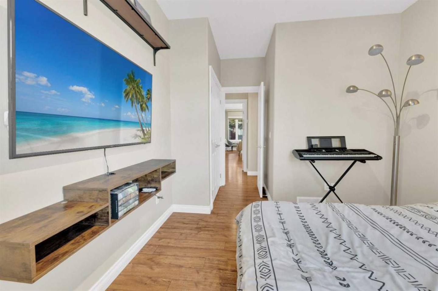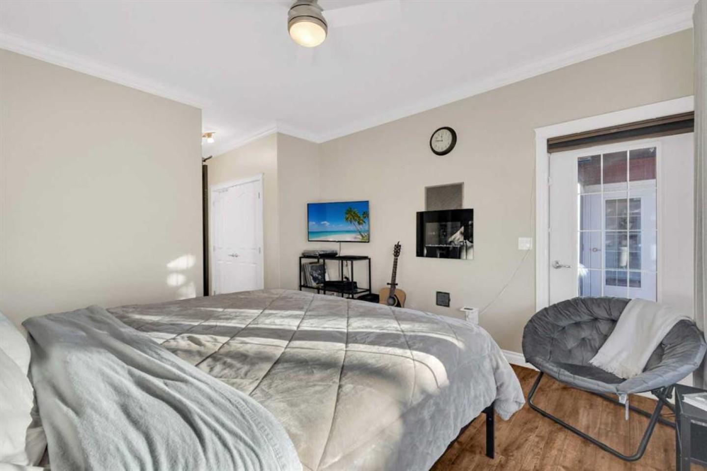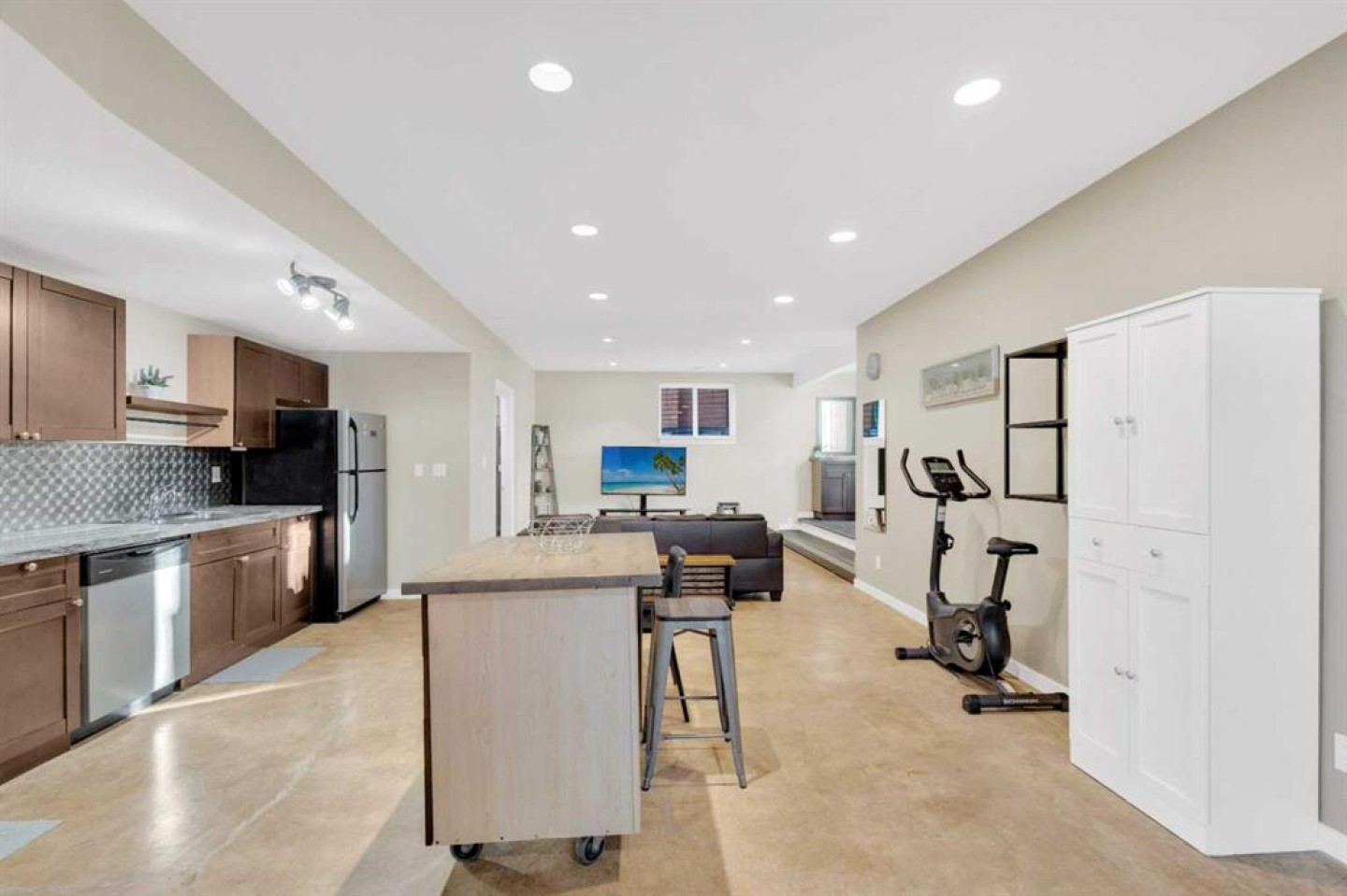 The main floor features a bright, open, south-facing layout with fresh paint throughout, creating a warm and inviting atmosphere. The spacious living room is anchored by a corner gas fireplace and flows seamlessly into the dining area and well-equipped kitchen—ideal for both everyday living and entertaining. The dining space opens onto the deck, complete with a gas line for your BBQ, making outdoor entertaining effortless. The primary bedroom is perfectly positioned at the back of the home, backing onto the south-facing yard and offering exceptional privacy. Enjoy direct access to the deck, a comfortable ensuite, and a layout designed for relaxation. A second bedroom, full bathroom, and convenient main-floor laundry complete this level. Downstairs, the walk-up basement with separate entrance adds incredible value and versatility. The fully finished suite offers in-floor heating throughout, a full kitchen, living and dining area, bedroom, bathroom, and separate laundry—ideal for extended family, teenagers or guests. Two hot water tanks ensure comfort and convenience for both levels.