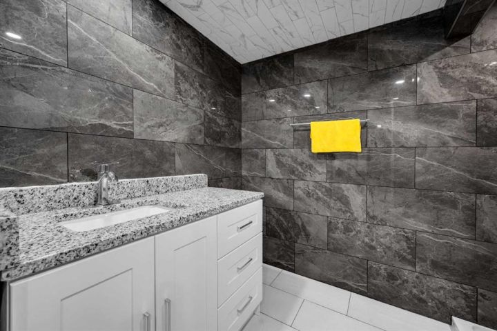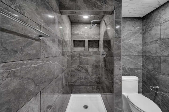 The fully finished basement offers a large rec that fits the whole family as well as a den and luxury Tile Wall Bathroom.