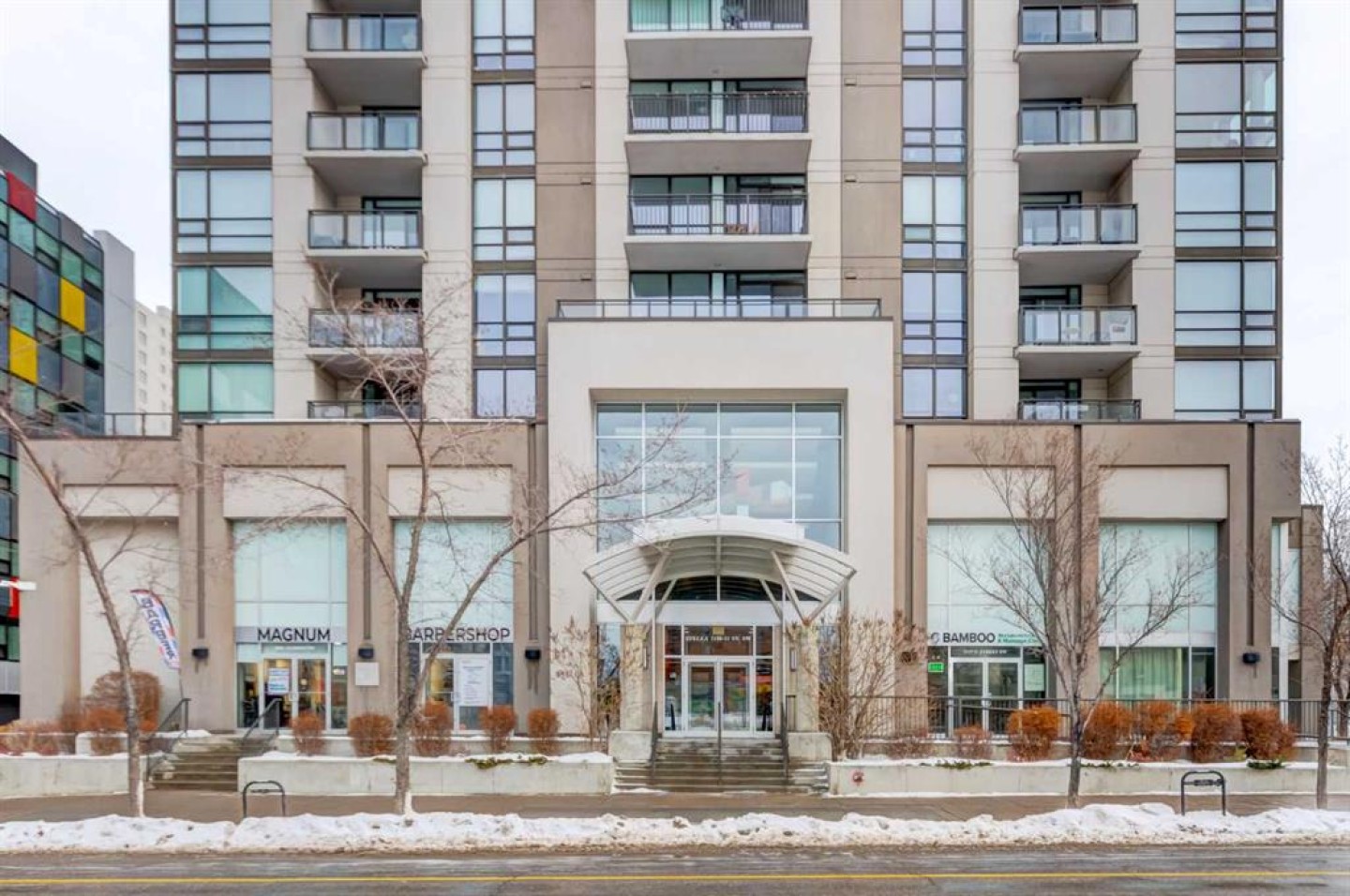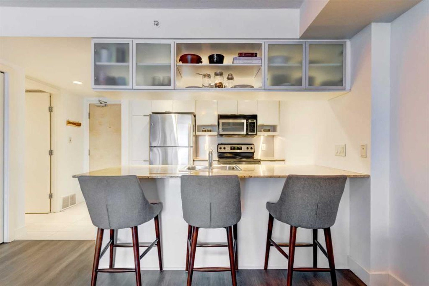 Welcome to this bright & beautifully designed 1-bedroom plus den home featuring a large west-facing balcony that spans the full width of the unit - relax as you watch the sunset! The open-concept layout is filled with natural light, creating an inviting & airy living space. The kitchen offers granite countertops, crisp white cabinetry & an extended eating bar, making it ideal for cooking, casual meals & entertaining. The spacious living/dining room easily accommodates a full dining table, offering flexibility for both daily living & hosting. The king-sized primary bedroom provides comfort & room to spare & the cheater ensuite boasts a soaker tub & separate shower. Imagine working from home in your den that overlooks the balcony through floor-to-ceiling windows & is generously sized to fit a queen bed, making it an excellent guest room, office, or multipurpose space. Located in a well-constructed concrete building, this home features durable vinyl plank flooring, adding style & practicality. Included is one titled underground parking stall & a separate storage locker for added convenience. Residents enjoy an impressive array of amenities, including concierge service, a fitness centre, a guest suite, a social room, & underground visitor parking. All of this is just steps from grocery stores, boutique shopping, restaurants, coffee shops, & pubs—offering an unbeatable urban lifestyle. Welcome home! You’ll love living here!!!