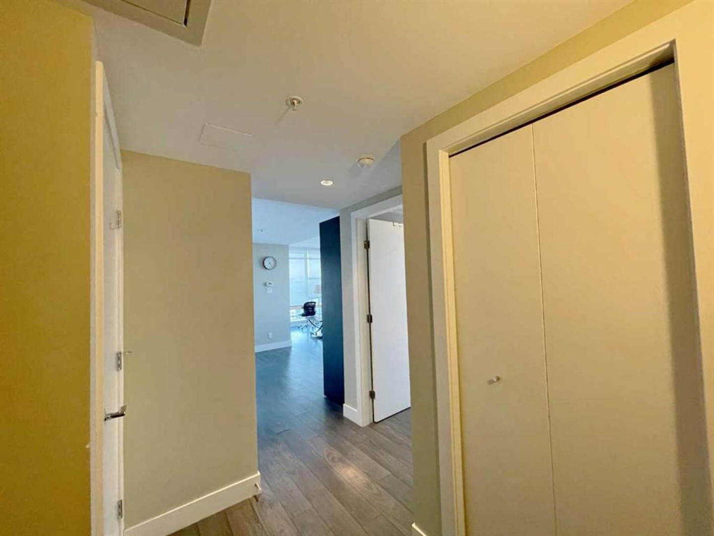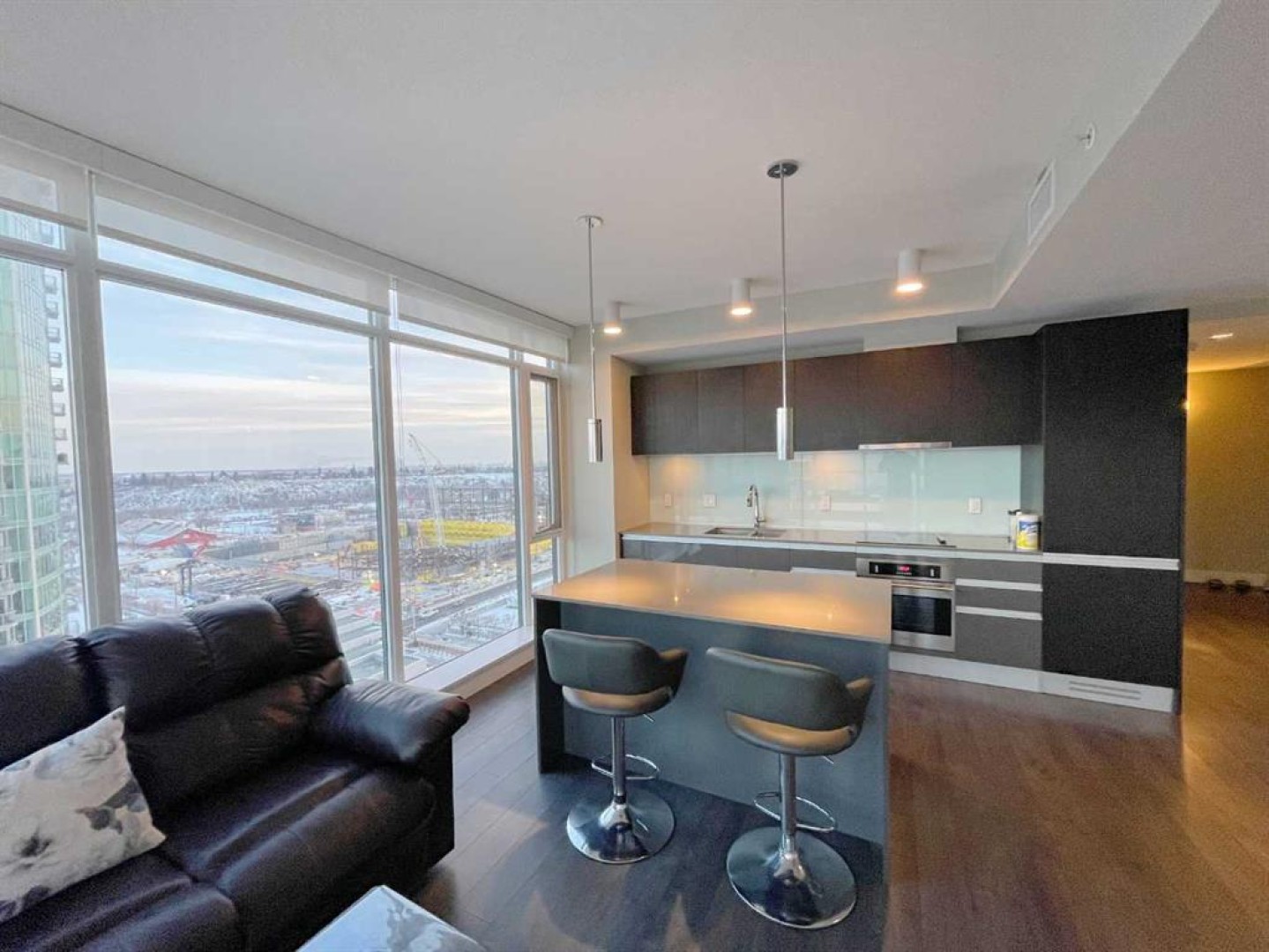 Welcome to The Guardian, Calgary’s tallest and one of its most sophisticated residential towers, where contemporary design meets vibrant urban living. This stunning corner unit offers 2 bedrooms and 2 bathrooms with a smart split-bedroom layout that maximizes privacy, along with floor-to-ceiling windows that frame breathtaking panoramic views of downtown, the river, East Village, and Stampede Park—often extending all the way to the mountains on a clear day. The open-concept living area is anchored by a sleek modern kitchen featuring quartz countertops, a large island with breakfast-bar seating, high-end stainless-steel appliances including an integrated refrigerator and concealed hood fan, and streamlined European-inspired cabinetry. The spacious primary bedroom includes a serene, spa-like ensuite, while the second bedroom enjoys its own private location at the front corner of the home—ideal for guests, roommates, or a home office. Everyday convenience is enhanced by in-suite laundry, titled underground parking, and a separate storage locker. Residents also enjoy exceptional building amenities including a fully equipped fitness centre, yoga studio, concierge service, social lounge, workshop, and a beautiful garden terrace with BBQ areas—perfect for relaxing or entertaining. Ideally located in the heart of historic Victoria Park, you’re just steps from the Saddledome, Stampede Park, Studio Bell, the Central Library, C-Train access, river pathways, restaurants, cafés, and the city’s best entertainment. This is elevated urban living at its finest.
