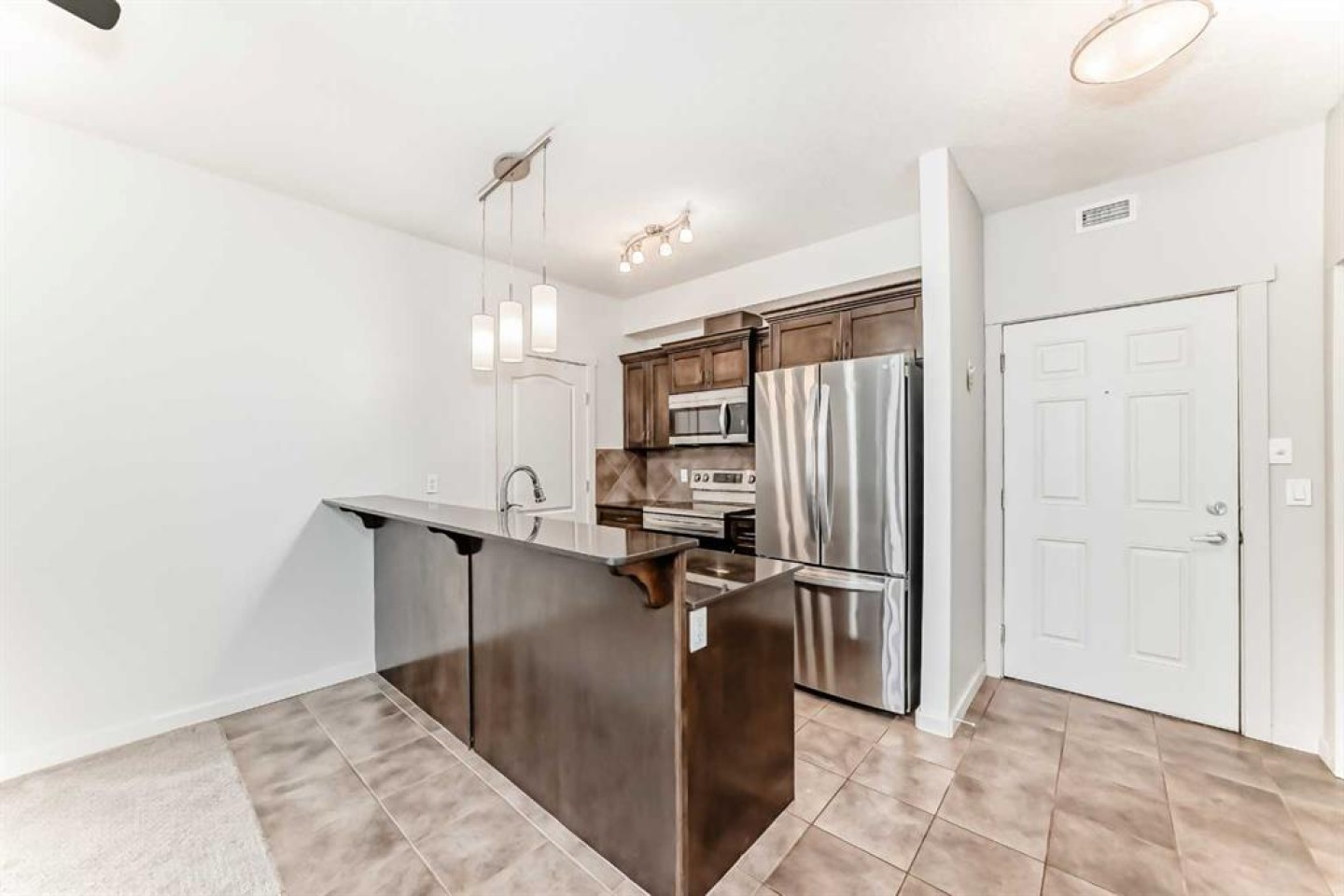 Looking for a modern, move-in-ready condo for sale in Cochrane? This spacious 2-bedroom, 2-bathroom home offers a bright, open-concept living area with large windows and a layout designed for both comfort and style, located in the desirable East End community. Enjoy a modern kitchen featuring stainless steel appliances, granite countertops, a sit-up breakfast bar, and maple cabinetry providing ample storage. The generous living room includes a gas fireplace for chilly evenings and opens onto a private patio—perfect for BBQs, relaxing, or entertaining friends and family.