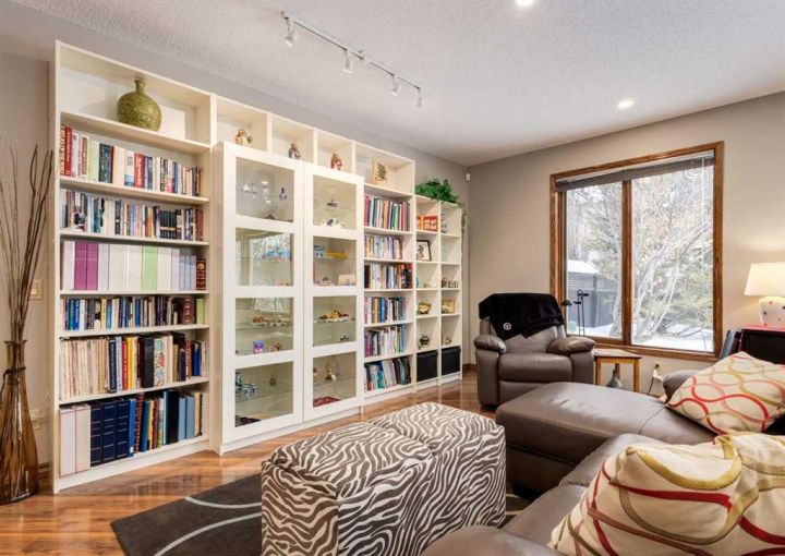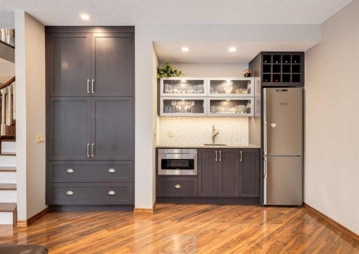 Microwave and Fridge in basement bar, organizer in primary walk in closet, hanging racks in ensuite bathroom. Shelf in living room. Shelves in den. The mirrored wardrobe in primary bedroom and basement are negotiable.