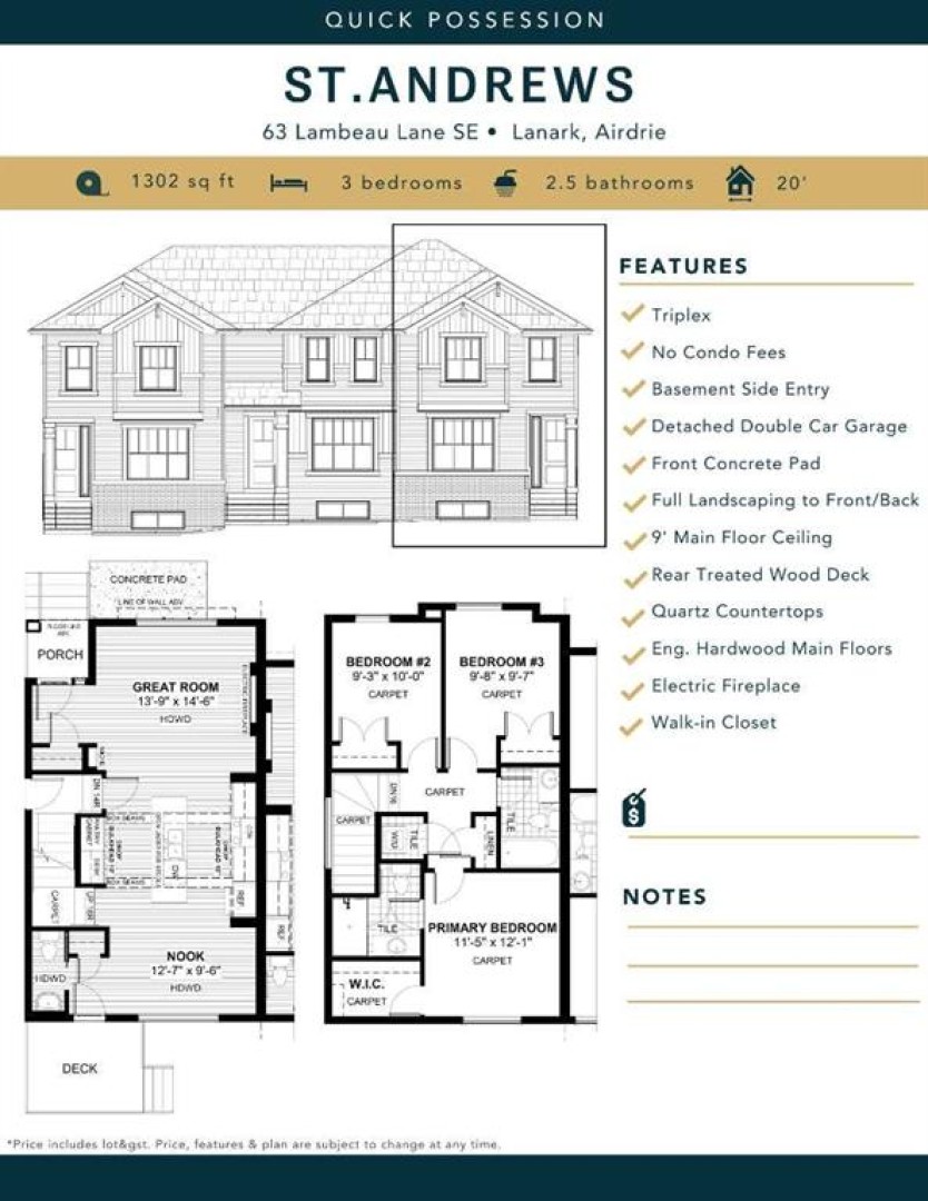 PLEASE NOTE: UNTIL JAN 18, PRICE CAN BE REDUCED BY ADDITIONAL $7500 DUE TO DEVELOPER BONUS. END UNIT, SIDE ENTRY TO BASEMENT, IMMEDIATE POSSSESSION , DOUBLE DETACHED GARAGE, DECK, FENCED AND LANDSCAPED, NO CONDO FEES. Welcome to the "St. Andrews" townhome, by Award winning, Master Builder, Douglas Homes Ltd. From the front covered porch, the entry opens onto the spacious great room with 9ft ceiling, electric fireplace, and gleaming hardwood floors throughout the main floor. The aspiring chef will appreciate the well planned "island" kitchen. From the upgraded 42 inch, soft close cabinets, to the gorgeous quartz countertops, everything is within easy reach. The sparkling stainless steel fridge, the glass top, self cleaning electric range, dishwasher, and over the range microwave/hoodfan are all just an arms length from the kitchen sink. Opposite side of the island, provides a convenient pantry, and desk with upper cabinet for all those recipe books you will collect. The spacious dining area features a large picture window looking out upon the back yard with room for the kids to play, with a rear entry door to the deck for those summer bbq's. Here also is a 2pc powder room for your guests convenience, and perhaps the kids hurried need. Upstairs includes 2 good sized secondary bedrooms, a 4pce bathroom with quartz vanity and tile floors, a convenient upstairs laundry, and a spacious primary bedroom with large upsized window and ensuite bath, with walk in shower, with glass front, tile floor and again a quartz vanity. The full basement provides rough in plumbing for a future bath, one window for future bedroom, and enough space remaining for a spacious future family room if you decide your family needs room to spread.