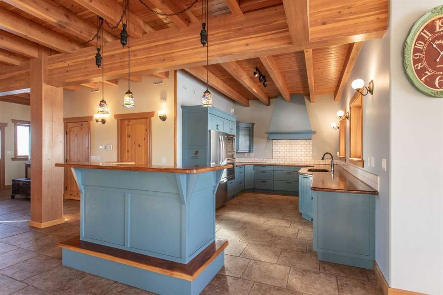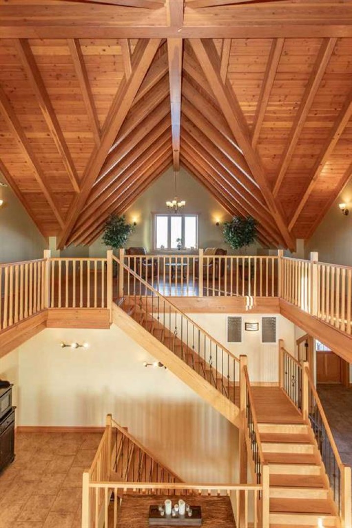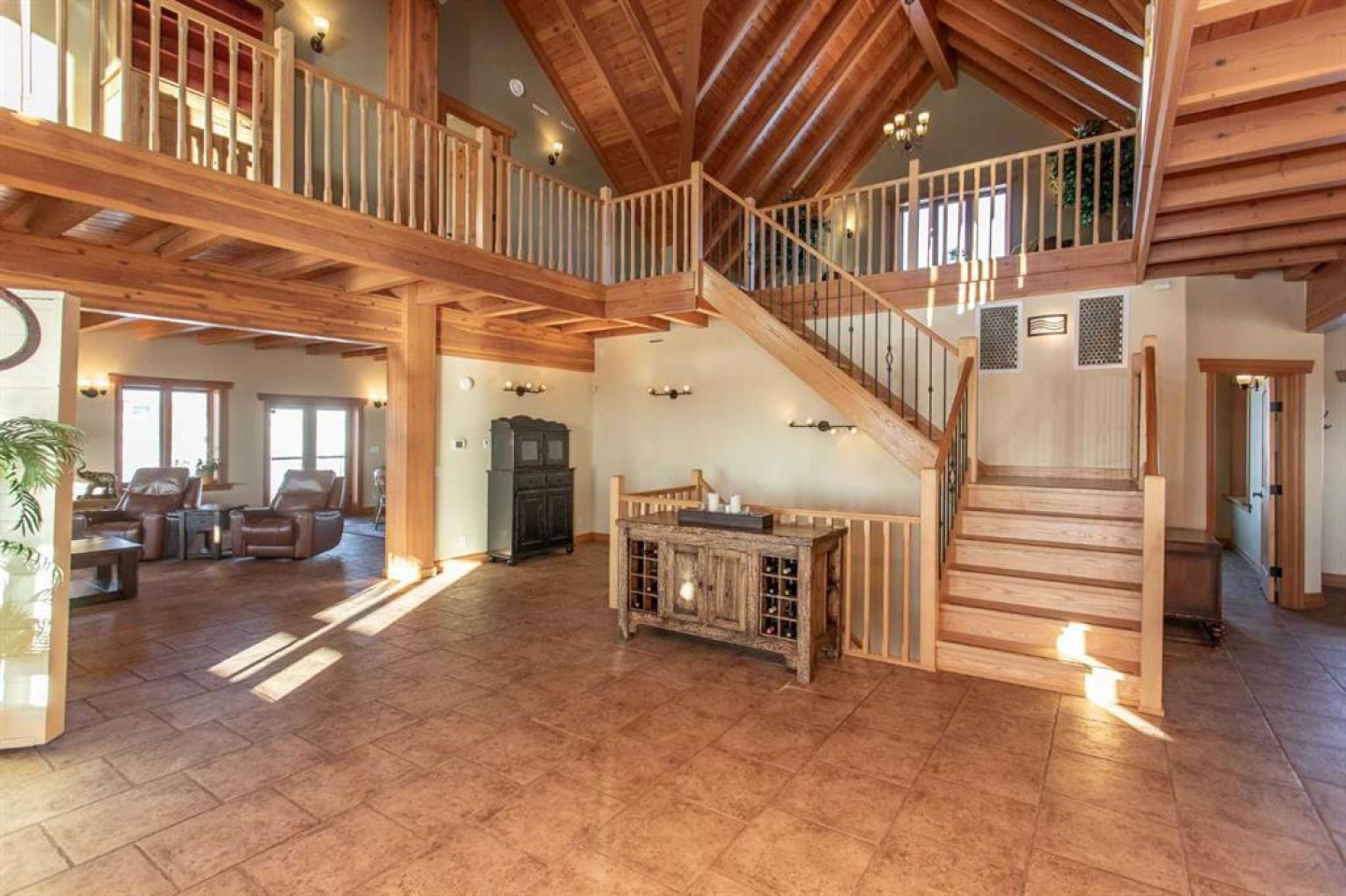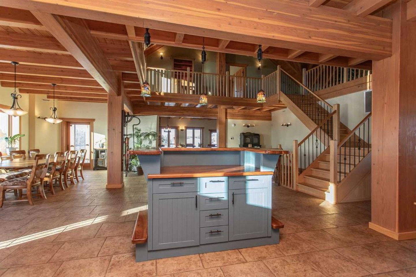 Inside, Douglas Fir post-and-beam construction, soaring ceilings, an interior mezzanine, and an open-concept layout create a warm, inviting atmosphere filled with natural light. Covered balconies and walkout basement invite you to enjoy seamless indoor-outdoor living. Fine craftsmanship is evident throughout, from fir hardwood and custom ash cabinetry to walnut countertops and travertine-finished bathrooms. The main living and dining areas are spacious and welcoming, anchored by a beautiful wood-burning fireplace. The kitchen is thoughtfully designed with a center island, wood countertops, new appliances, and generous cabinetry.
