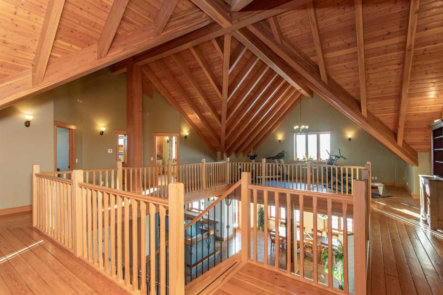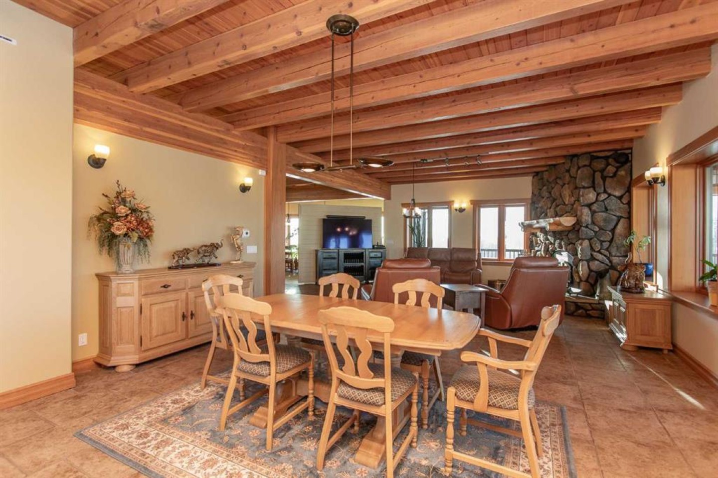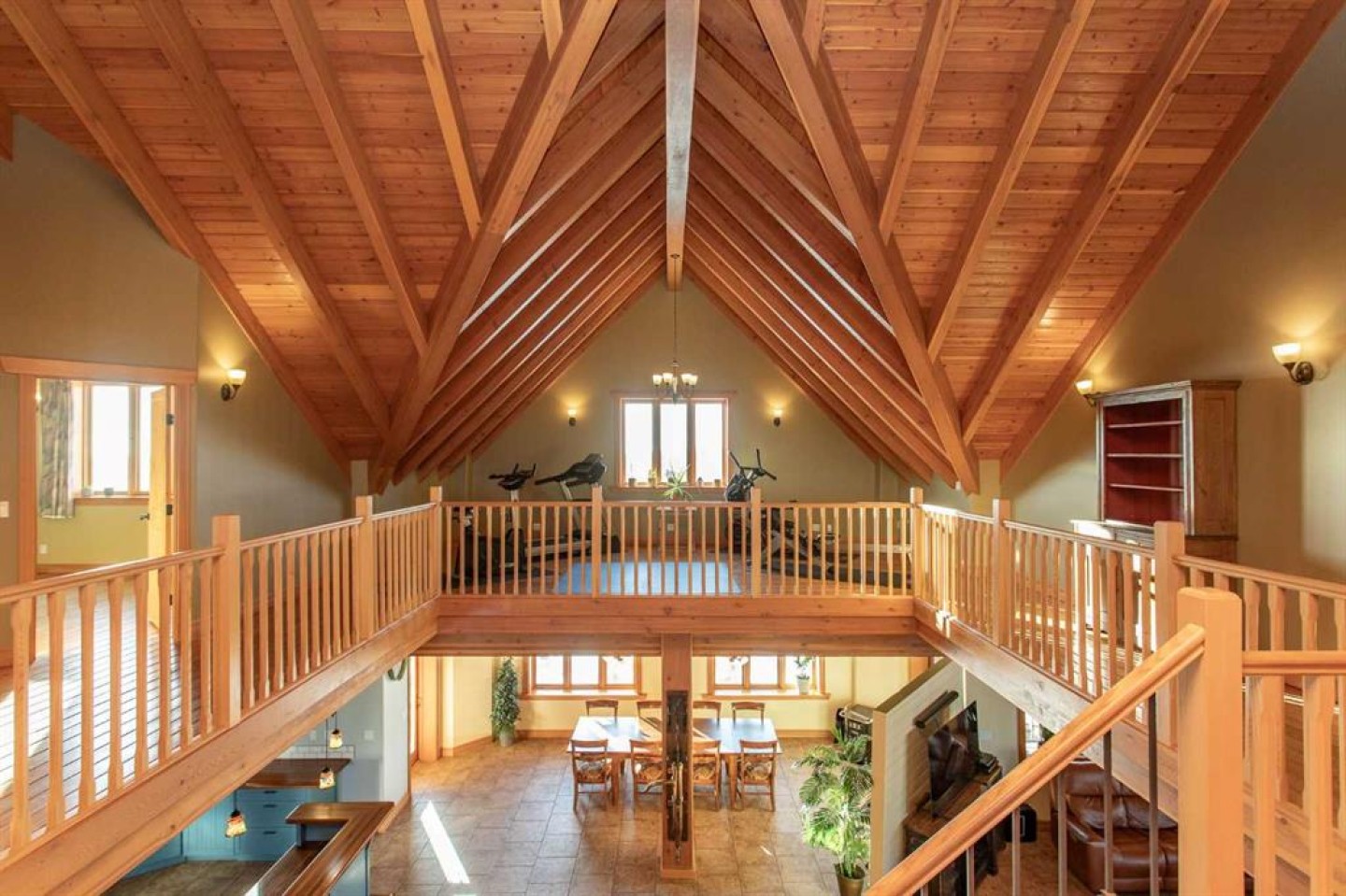 Inside, Douglas Fir post-and-beam construction, soaring ceilings, an interior mezzanine, and an open-concept layout create a warm, inviting atmosphere filled with natural light. Covered balconies and walkout basement invite you to enjoy seamless indoor-outdoor living. Fine craftsmanship is evident throughout, from fir hardwood and custom ash cabinetry to walnut countertops and travertine-finished bathrooms. The main living and dining areas are spacious and welcoming, anchored by a beautiful wood-burning fireplace. The kitchen is thoughtfully designed with a center island, wood countertops, new appliances, and generous cabinetry.