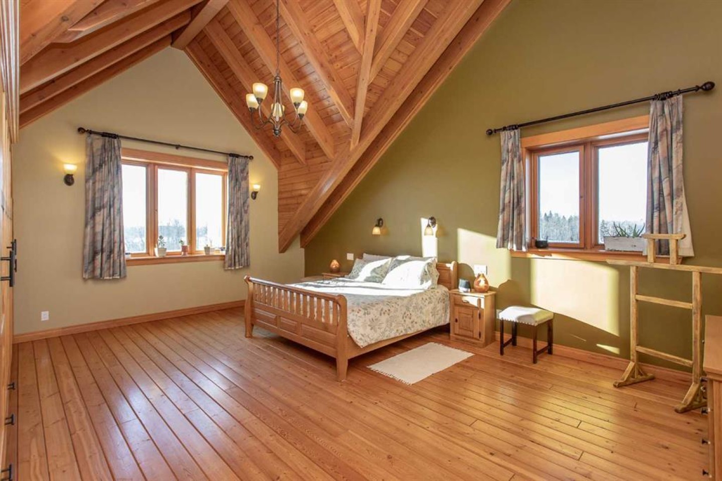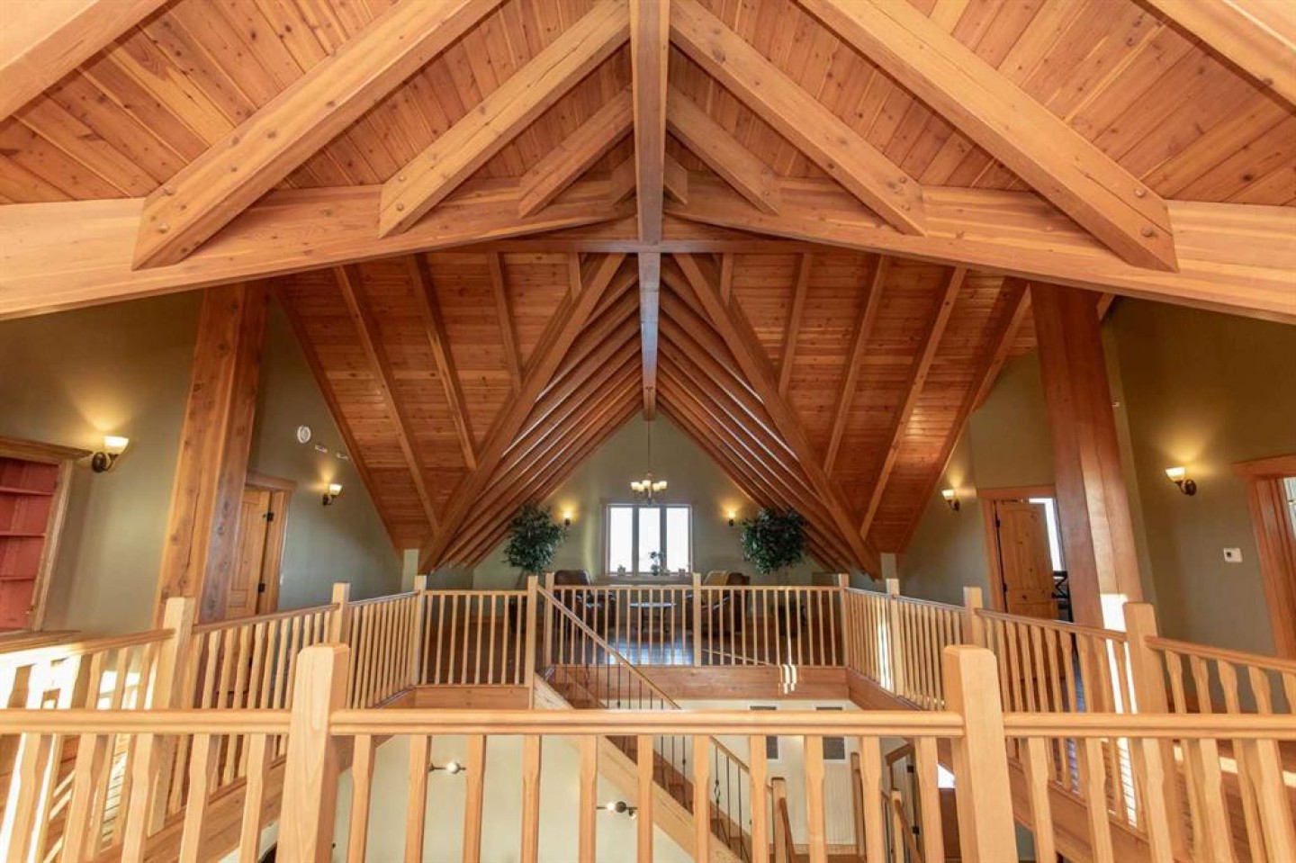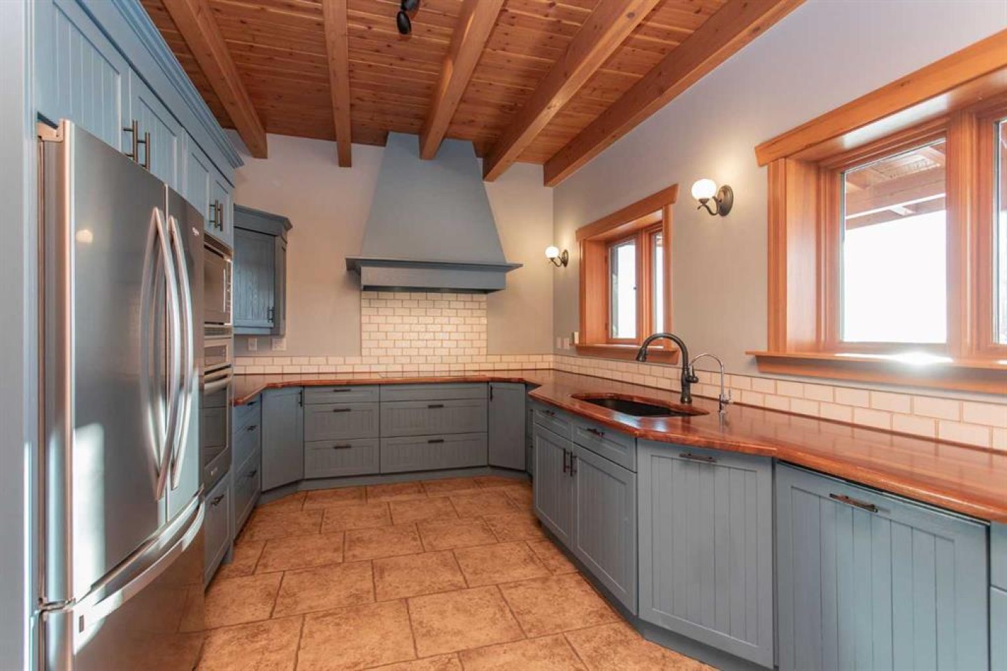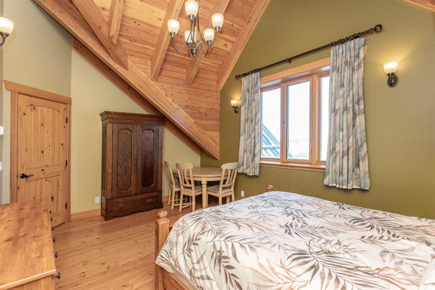 Inside, Douglas Fir post-and-beam construction, soaring ceilings, an interior mezzanine, and an open-concept layout create a warm, inviting atmosphere filled with natural light. Covered balconies and walkout basement invite you to enjoy seamless indoor-outdoor living. Fine craftsmanship is evident throughout, from fir hardwood and custom ash cabinetry to walnut countertops and travertine-finished bathrooms. The main living and dining areas are spacious and welcoming, anchored by a beautiful wood-burning fireplace. The kitchen is thoughtfully designed with a center island, wood countertops, new appliances, and generous cabinetry.