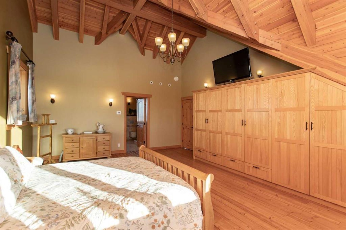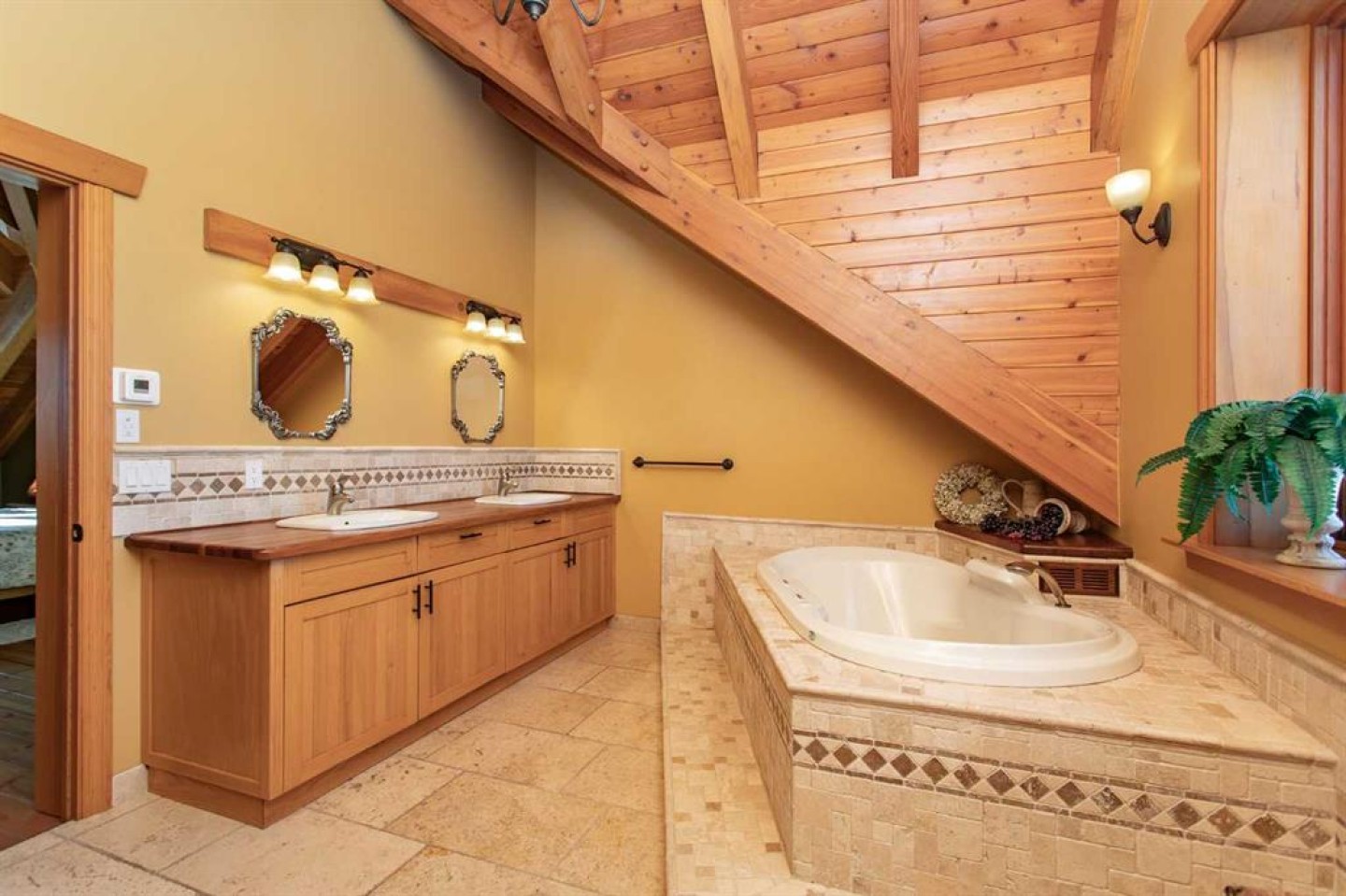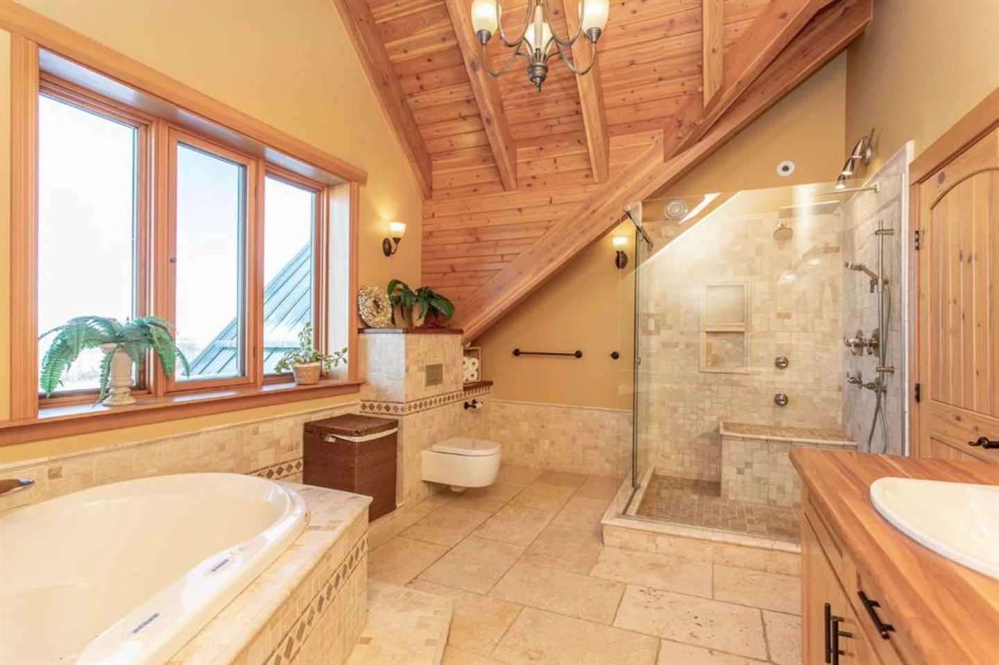 Bar, Beamed Ceilings, Breakfast Bar, Double Vanity, French Door, High Ceilings, Jetted Tub, Natural Woodwork, Open Floorplan, Pantry, Sauna, See Remarks, Soaking Tub, Storage, Vaulted Ceiling(s)