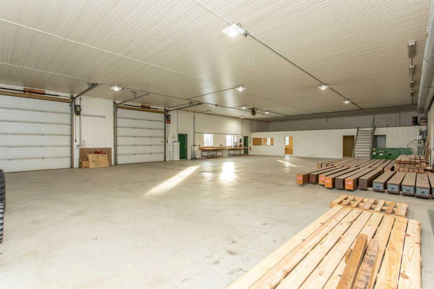 13,500 Sq.Ft. Shop - insulated with radiant heat, drains, 14 ft ceilings, 6 overhead doors, mezzanine, office, kitchen, bathroom, 220V, 7 air compressor lines, 20KVA back-up generator with auto transfer, water treatment system