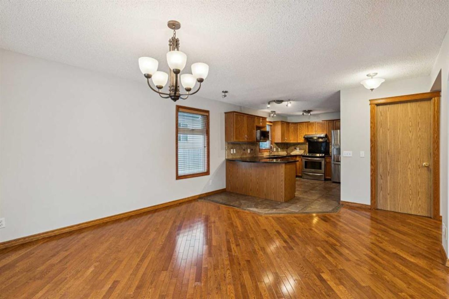 The main floor features soaring vaulted ceilings, hardwood flooring, and a bright living room anchored by a cozy gas fireplace. The spacious kitchen is thoughtfully designed with granite countertops, ample cabinetry, stainless steel appliances, tile flooring, and a breakfast bar, flowing seamlessly into the dining area. Sliding patio doors provide direct access to the backyard, making indoor-outdoor living effortless.