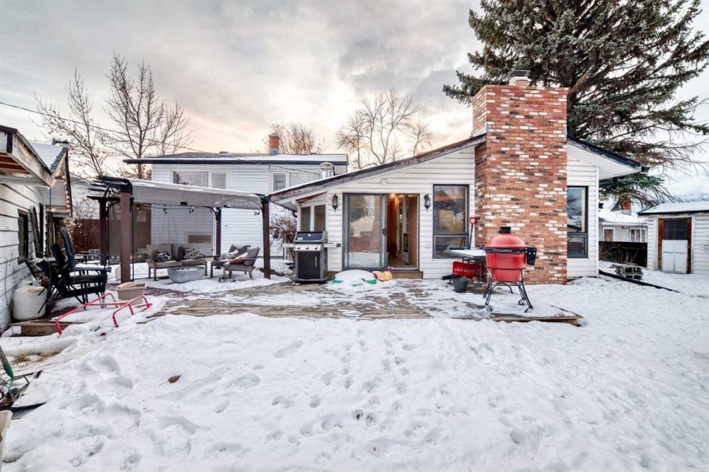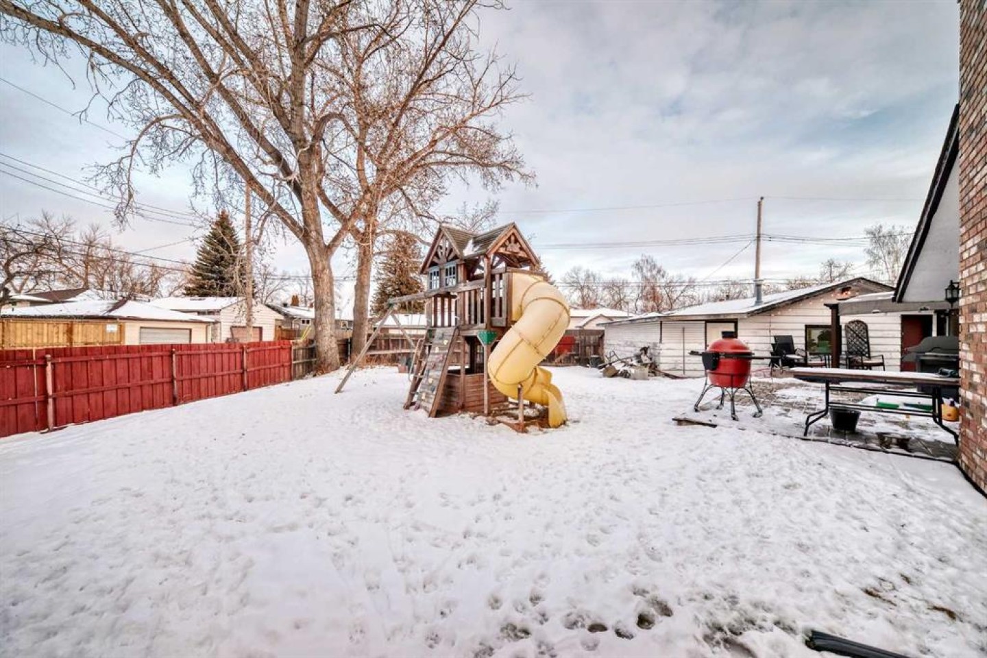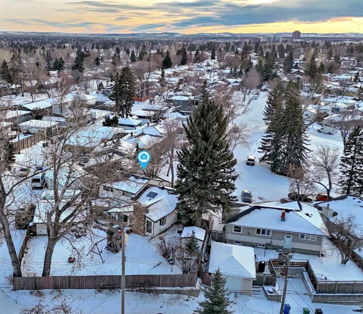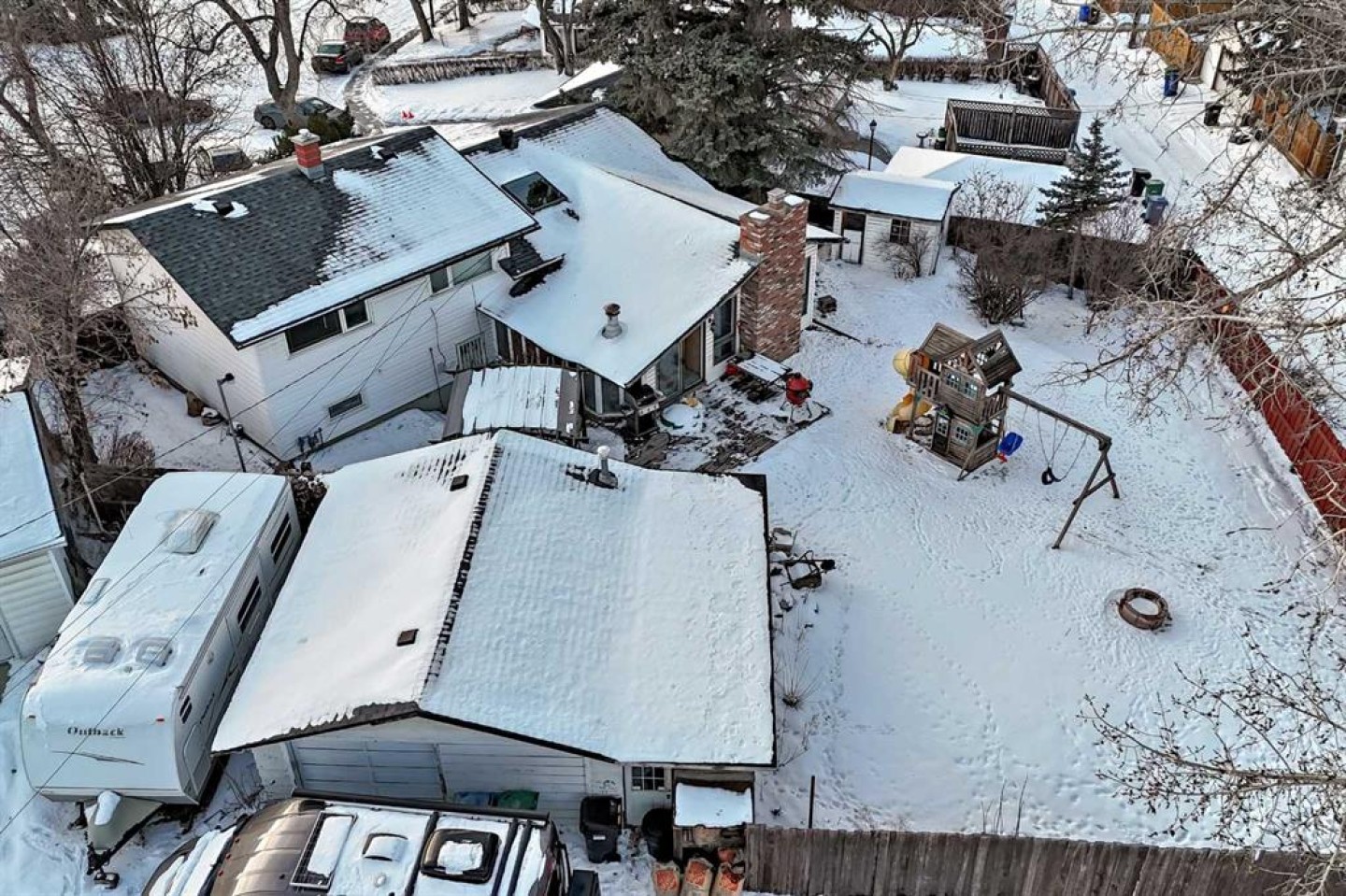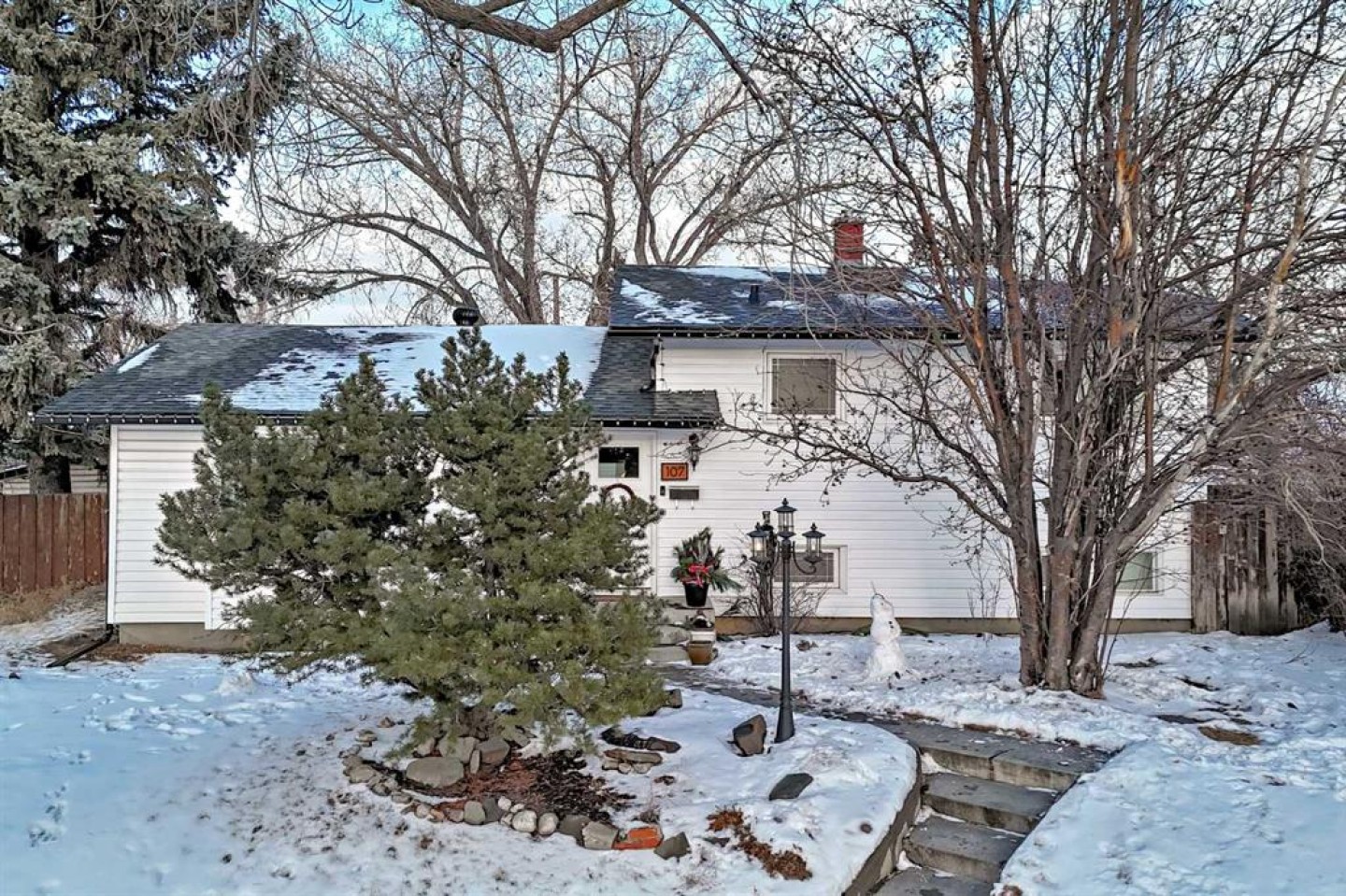 Exceptional location for this mid-century home, perched high above Foster Park on an enormous 1/5-acre pie-shaped lot. This character-rich 4-bedroom, 2-bath, four-level split offers over 2,100 sq. ft. of developed living space. The reimagined kitchen—complete with skylight and granite countertops—has been thoughtfully redesigned as the central hub of the home. Adjacent are a generous foyer, full dining room, and charming front living room featuring French doors, original hardwood floors, and mountain views over the park. A rear family room addition sympathetically extends the original 1950s floor plan and includes a mantled gas fireplace and access to an enclosed, heated hot tub room (hot tub as-is; not included in square footage). Step out to the rear deck and enjoy the truly enormous pie-shaped backyard (approx. 800 m²!). Upstairs offers three bedrooms and a renovated 4-piece main bath. The lower level features a fourth bedroom, additional 4-piece bath, large laundry room, and mudroom with walk-out access. The lower basement includes a cozy media room with fireplace and lots of flexible space including a bonus/ hobby room under the addition. A double garage, 2 large sheds, play structure complete and RV pad complete your own "private park". Recent improvements include new furnace, roof, sewer line and siding. A rare opportunity to own a “small acreage” in the inner city! Set high on Fairview Hill, Fawn is a "secret" quiet street looping around a park, yet close to all the best inner-city amenities. Enjoy easy walking and biking access to the Calgary Farmers’ Market, pubs, restaurants, excellent schools, and coffee shops, with downtown just a 15-minute drive. Chinook Station, Chinook Centre, and Costco are even closer! Open House: Saturday & Sunday, 2:00–4:30 PM.