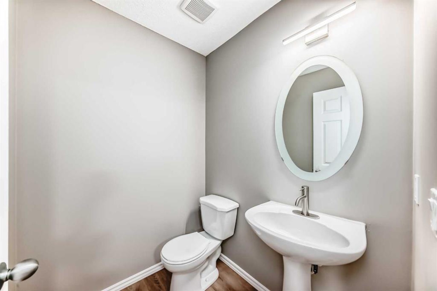 The open-concept main floor is designed for both function and flow, offering a bright living area with built-in cabinetry and a dedicated dining space with direct access to the backyard through sliding patio doors. A convenient powder room completes this level.