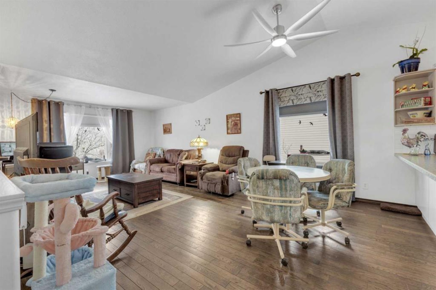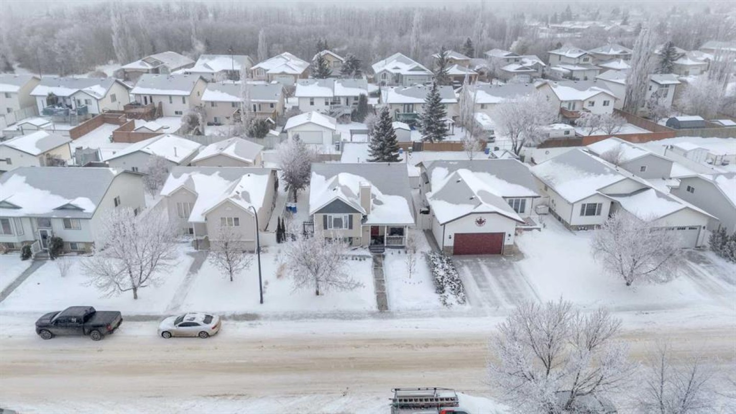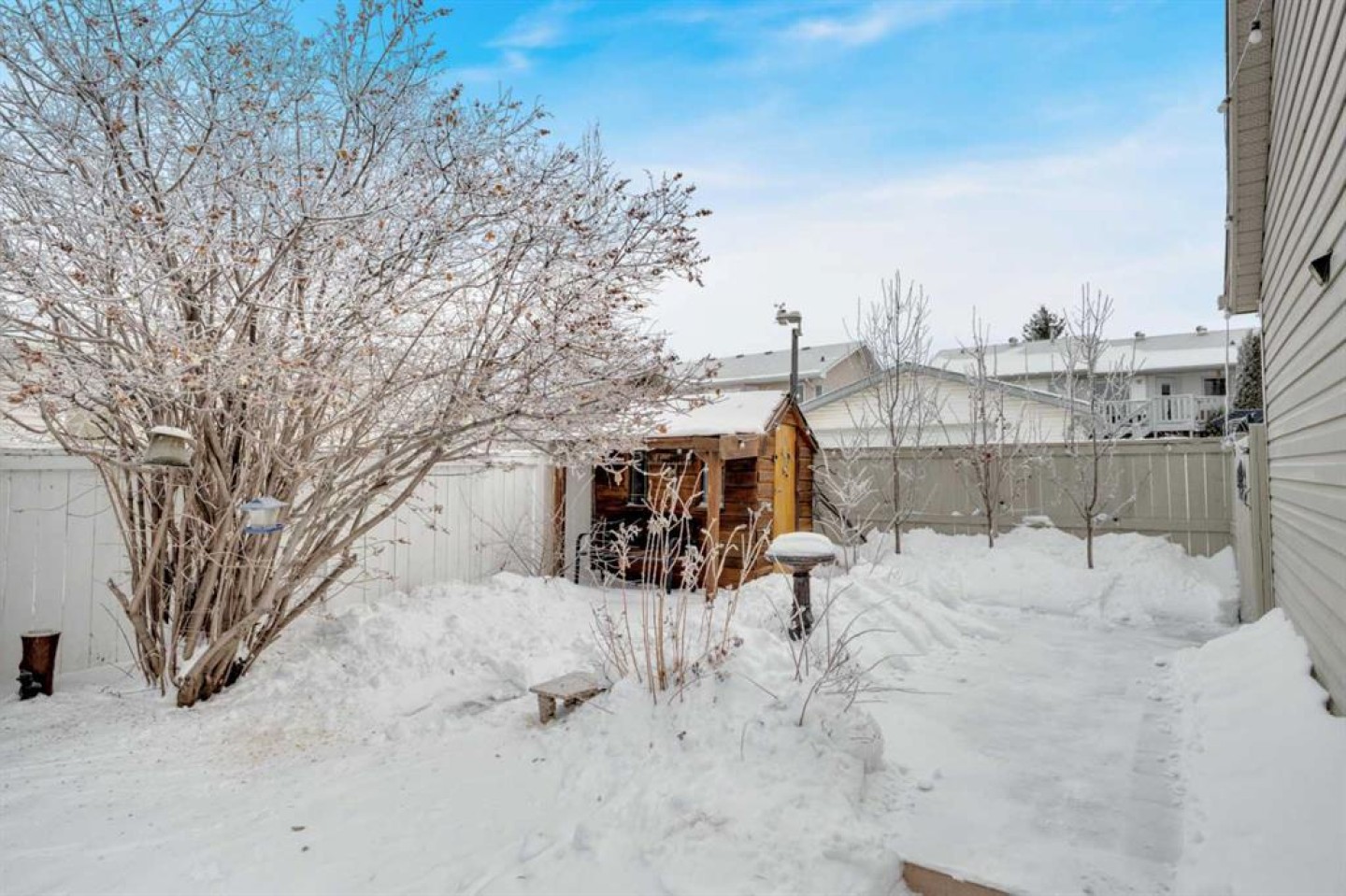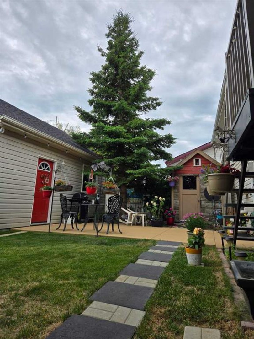 This well-maintained home is surrounded by stunning, mature landscaping featuring an abundance of flowering perennials, established trees, and vibrant shrubs that create incredible curb appeal and a private, park-like setting ~ Peace of mind comes with major updates completed within the last year, including the furnace, humidifier, hot water tank, and central air conditioning, while the garage door and kitchen appliances (fridge, stove, dishwasher, and microwave) are all under five years old ~ The front yard showcases lush gardens and mature trees, while the west-facing covered veranda offers the perfect place to relax and enjoy evening sun ~ Inside, the open concept main floor is highlighted by vaulted ceilings and rich hardwood flooring, enhancing the sense of space ~ The bright living room features a stylish fireplace with built-in shelving and a large picture window overlooking the front yard ~ The spacious dining area easily accommodates family gatherings and entertaining ~ The functional U-shaped kitchen offers ample cabinetry and counter space, with an eating bar, full tile backsplash, window over the sink, wall pantry, and garden door access to the covered deck ~ The primary bedroom comfortably fits a king-size bed, includes dual closets, and offers private access to the main four-piece bathroom through a cheater door ~ A second generously sized bedroom completes the main level ~ The fully developed basement features large above-grade windows, a spacious family room with a cozy gas-burning stove, a versatile flex area with mirrored closets, an additional bedroom, a three-piece bathroom, laundry area, and plenty of storage ~ The backyard is a true retreat with meticulously maintained gardens, mature trees, colorful flowers, garden beds, two sheds, enclosed storage under the deck, a loft in the garage, and multiple outdoor living spaces including a covered deck, lower concrete patio, and firepit area ~ Fully fenced with alley access to the double detached garage ~ Located close to multiple schools, parks, playgrounds, walking trails, the YMCA, shopping, and a wide range of amenities.