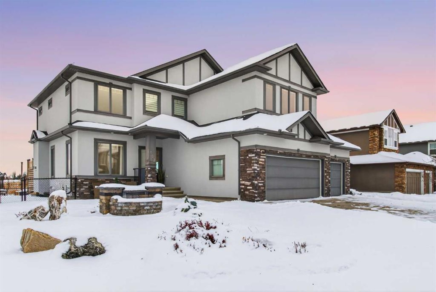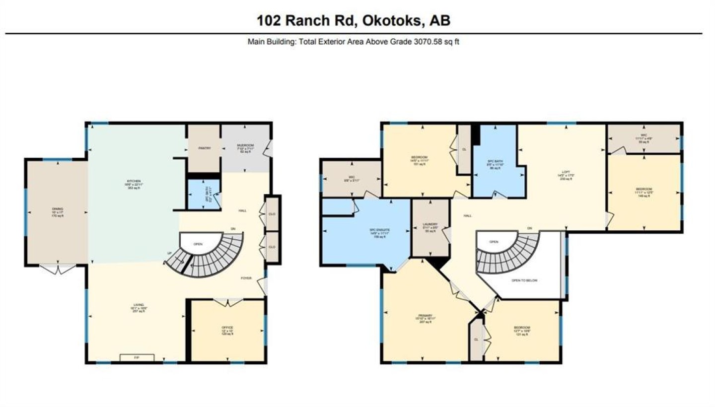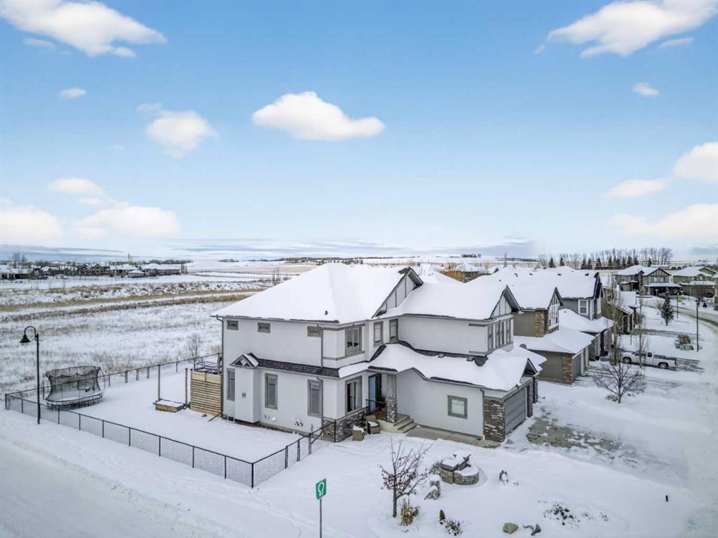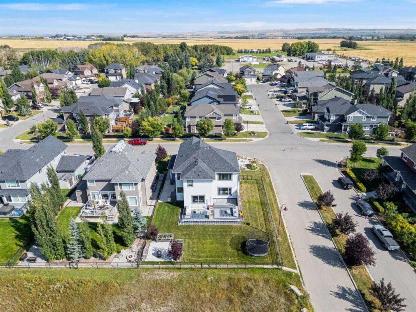 Welcome to 102 Ranch Road, a beautifully appointed 2-storey home in the prestigious Air Ranch community of Okotoks. Offering over 4,000 sq. ft. of finished living space, this property blends thoughtful design with luxurious features for everyday living. The main floor showcases rich hardwood flooring and an open-concept layout with a show-stopping spiral staircase that certainly makes a statement! The chef’s kitchen with quartz counters, premium appliances, walk-through pantry and a massive island are perfect for entertaining. A private office, stylish powder room, and mudroom with access to the heated triple garage add convenience. Upstairs, you’ll find a spacious bonus room, laundry, and four generous bedrooms, including a luxurious primary suite with spa-inspired 5-piece ensuite and oversized walk-in closet. The fully finished basement expands the living space with a large rec room, fitness room that could be an additional bedroom, another bedroom, and full bath—plus a rough-in for a future bar and additional basement laundry area. Step outside to your huge composite deck overlooking a big backyard designed for family fun, complete with a firepit and a trampoline. Additional features include two central A/C units, a medical-grade air filtration system, whole-home water filtration, underground sprinklers, and premium finishes throughout. Ideally located close to top-rated schools, parks, shopping, and golf, this exceptional property combines luxury, comfort, and community in one of Okotoks’ most desirable neighborhoods.