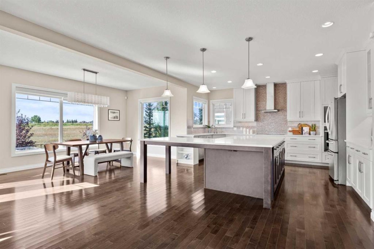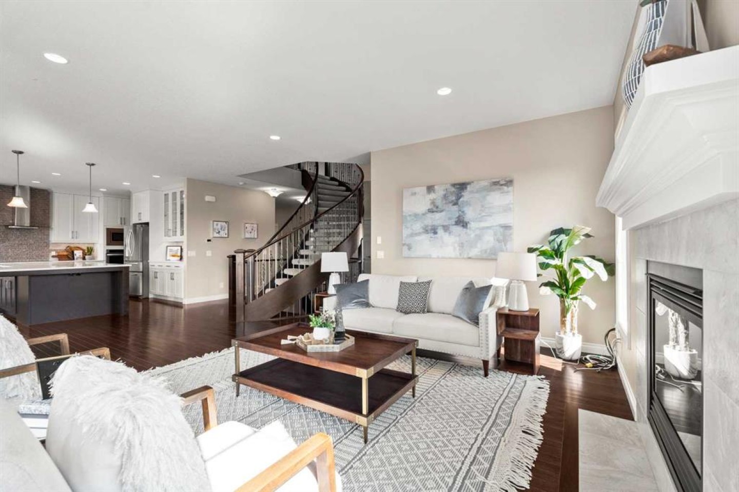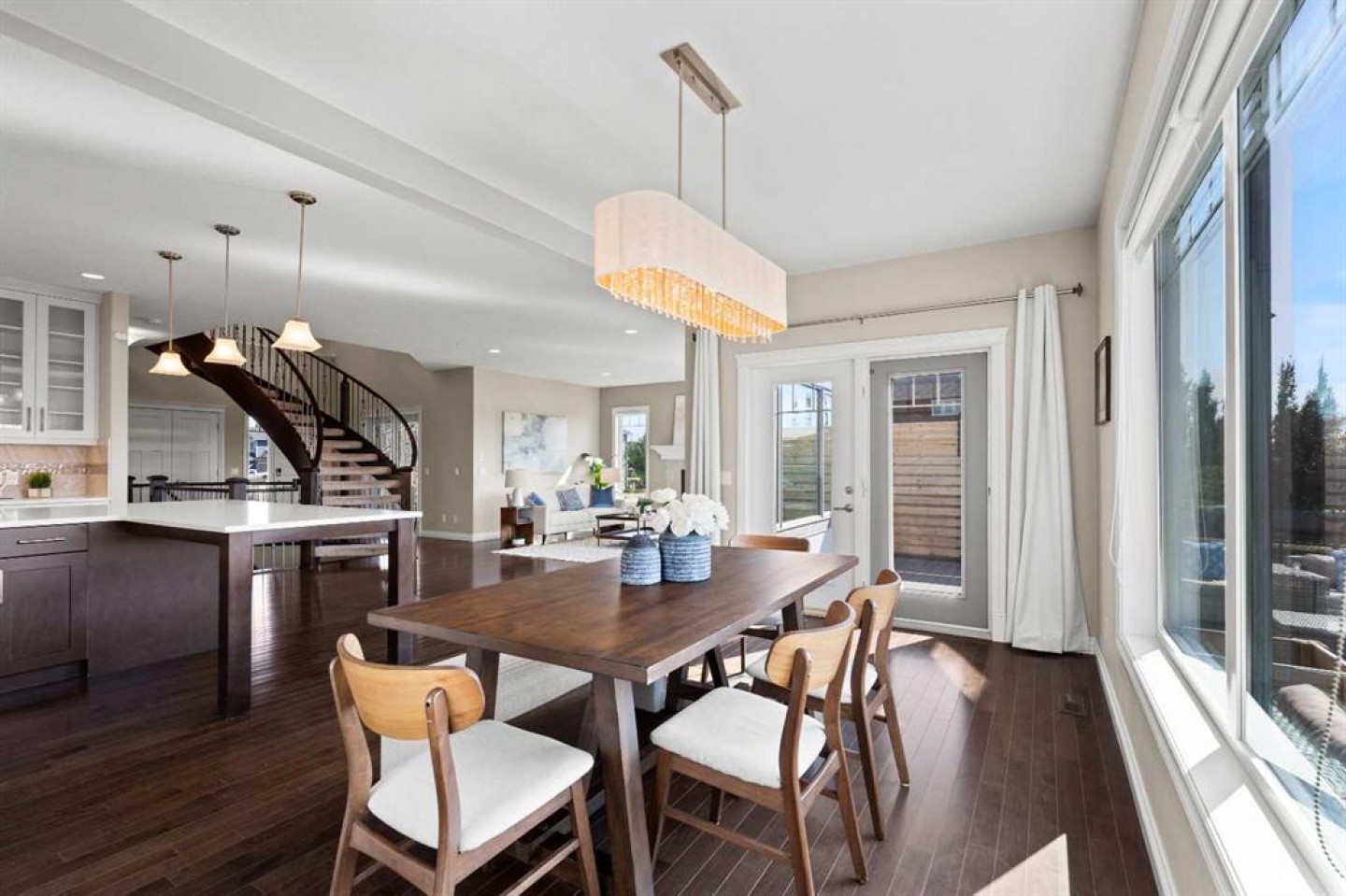 Welcome to 102 Ranch Road, a beautifully appointed 2-storey home in the prestigious Air Ranch community of Okotoks. Offering over 4,000 sq. ft. of finished living space, this property blends thoughtful design with luxurious features for everyday living. The main floor showcases rich hardwood flooring and an open-concept layout with a show-stopping spiral staircase that certainly makes a statement! The chef’s kitchen with quartz counters, premium appliances, walk-through pantry and a massive island are perfect for entertaining. A private office, stylish powder room, and mudroom with access to the heated triple garage add convenience. Upstairs, you’ll find a spacious bonus room, laundry, and four generous bedrooms, including a luxurious primary suite with spa-inspired 5-piece ensuite and oversized walk-in closet. The fully finished basement expands the living space with a large rec room, fitness room that could be an additional bedroom, another bedroom, and full bath—plus a rough-in for a future bar and additional basement laundry area. Step outside to your huge composite deck overlooking a big backyard designed for family fun, complete with a firepit and a trampoline. Additional features include two central A/C units, a medical-grade air filtration system, whole-home water filtration, underground sprinklers, and premium finishes throughout. Ideally located close to top-rated schools, parks, shopping, and golf, this exceptional property combines luxury, comfort, and community in one of Okotoks’ most desirable neighborhoods.