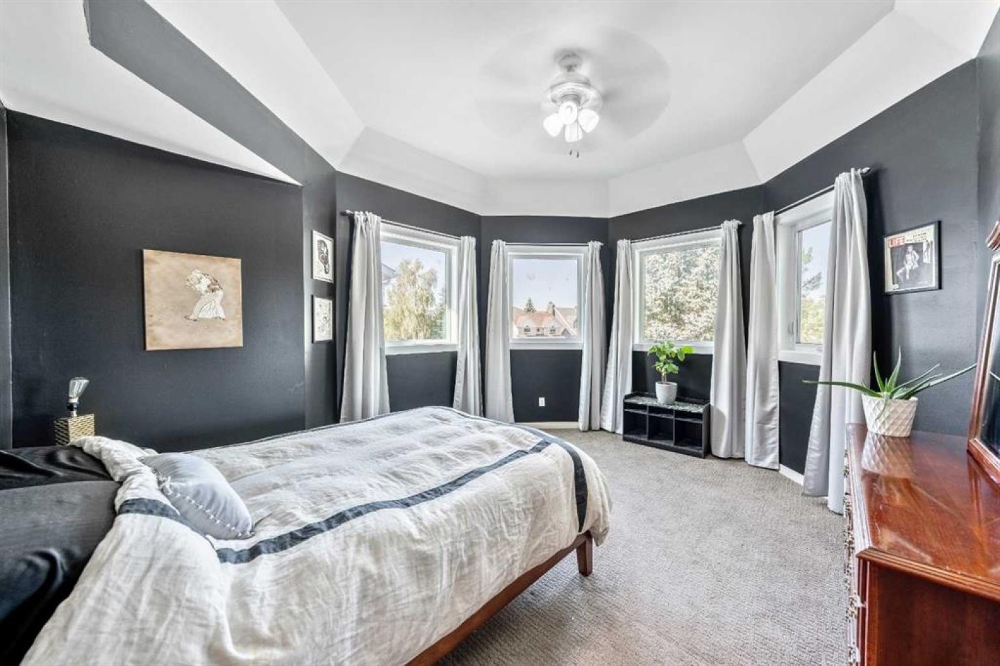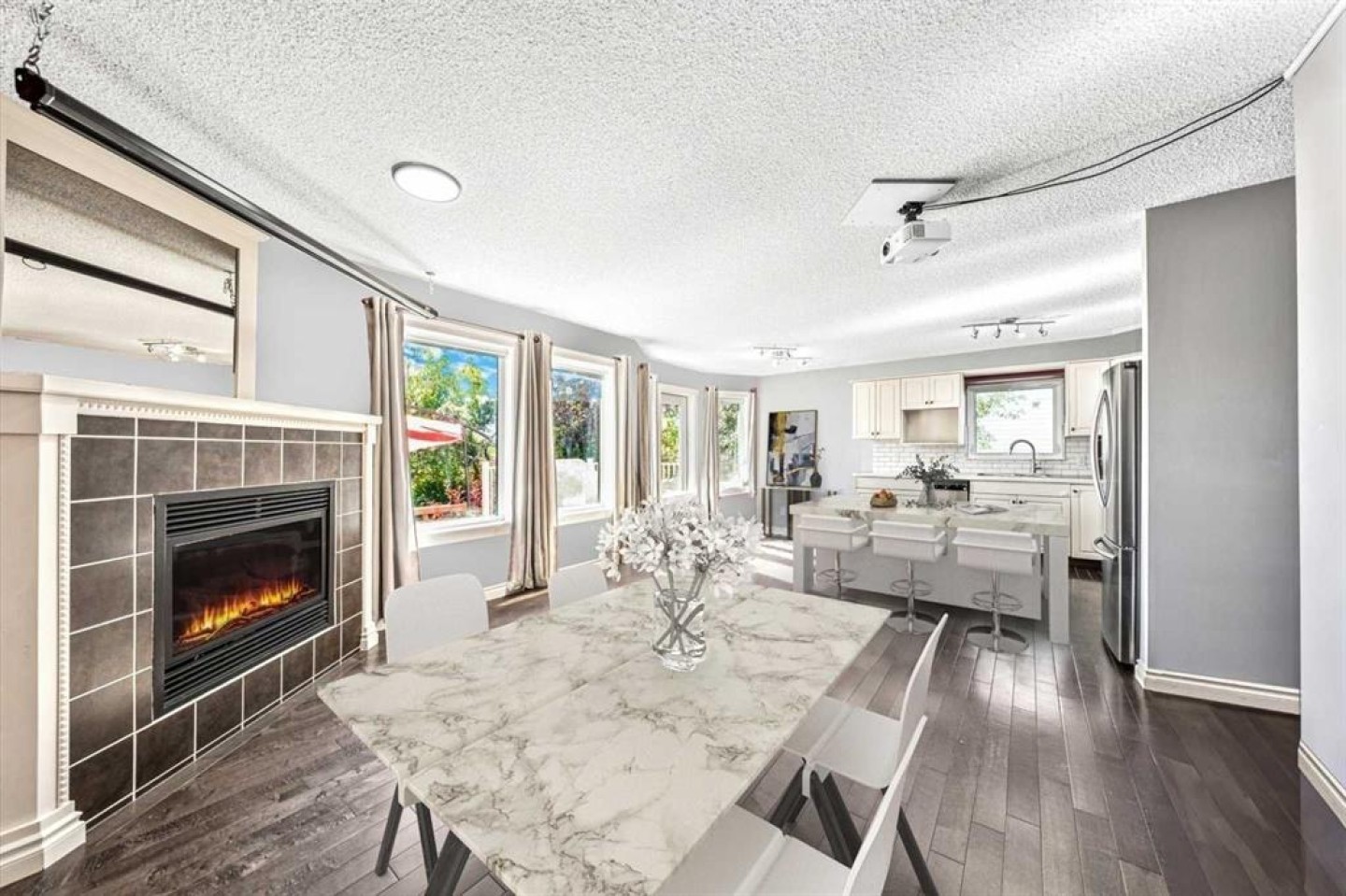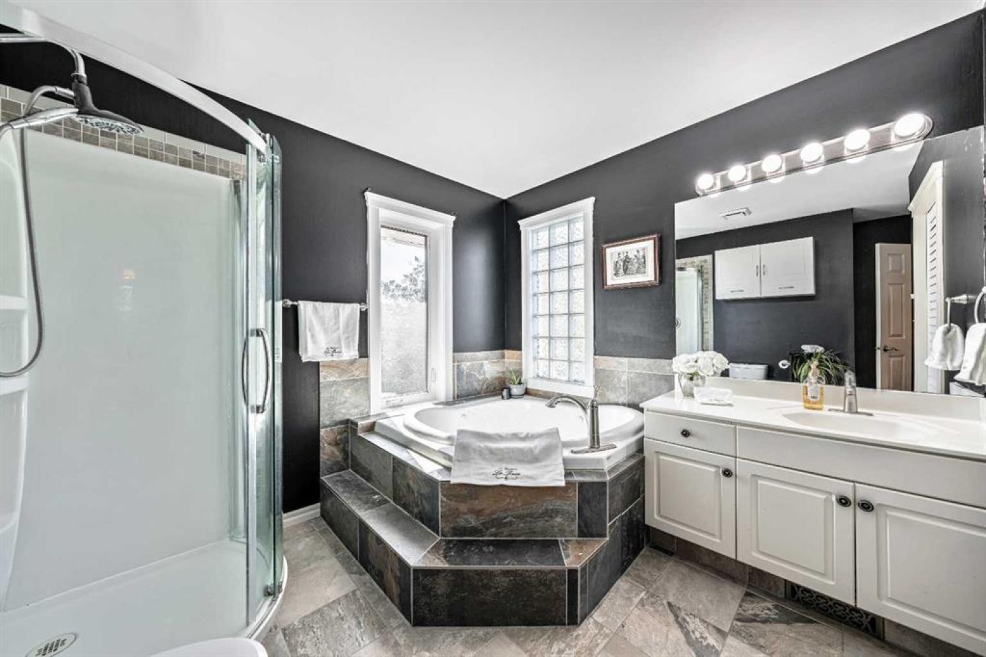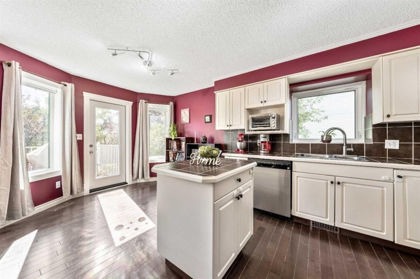 Don’t miss this storybook Westridge gem, tucked into one of Okotoks’ most sought-after cul-de-sacs and facing a picturesque park. This charming 2-storey offers over 2,930 sq. ft., 5 bedrooms, 3.5 baths, A/C, and a sunny south-facing backyard with a 3-tier deck. Bright foyer, formal dining with bay window park views, plus a flexible office/den. The open-concept rear features a cozy fireplace and a kitchen with bay windows, stainless steel appliances, ample cabinetry, and generous counter space. Upstairs: 3 bedrooms, bonus room, and a primary retreat with vaulted ceilings, turret bay windows, walk-in closet, and ensuite with heated floors, soaker tub, and separate shower. Fully finished basement includes 2 more bedrooms, rec/family spaces, renovated 3-piece bath, and lots of storage space. Outside: mature trees, gas hook-up, and a large south lot. Bonus: oversized heated double garage with 220V, its own furnace, and workshop space.